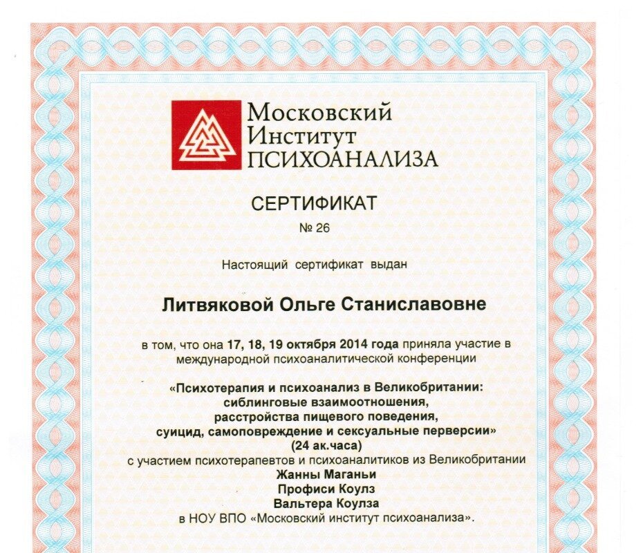 Московский институт психоанализа, сертификат о том, что приняла участие в конференции «Психотерапия и психоанализ в Великобритании: сиблинговые взаимоотношения, расстройства пищевого поведения, суицид, самоповреждение, сексуальные перверии», 24 ч - 2014 г.