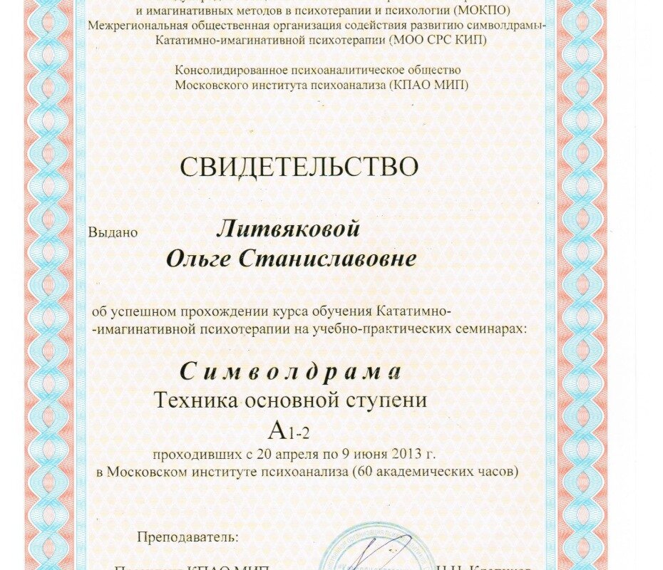 Московский институт психоанализа, свидетельство об успешном прохождении курса обучения кататимно-имагинативной психотерапии на учебно-практических семинарах «Символдрама. Техника основной ступени А1-2» (60 акад. часов) - 2013 г.