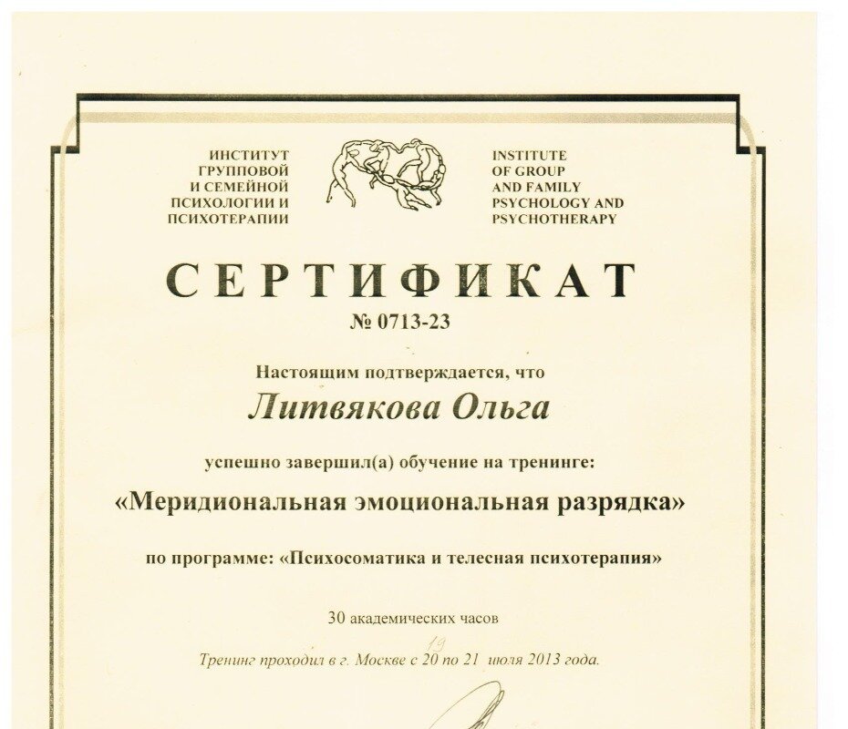 Институт групповой и семейной психологии и психотерапии, тренинг «Меридиональная эмоциональная разрядка» по программе «Психосоматика и телесная психотерапия», 30 часов - 2013 г.