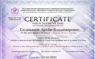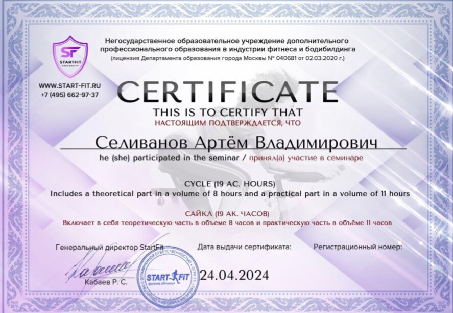 Сертификация тренерской деятельности в области сайклинга, функционального и силового тренинга.