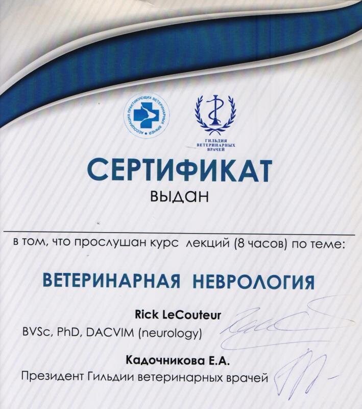 - Каждые 5 лет повышение квалификации «Плановая лечебно-профилактическая и лабораторно-диагностическая ветеринарная деятельность»