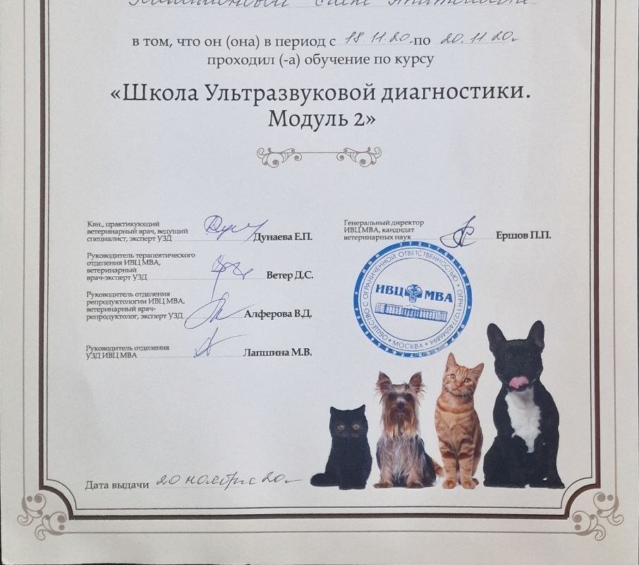 - Прохождение обучения базового, продвинутого модуля УЗД ИВЦ МВА, L.A.V. в 2020, 2021. Далее ежегодное обучение УЗД с командой L.A.V. с 2021-2022 гг по настоящее время