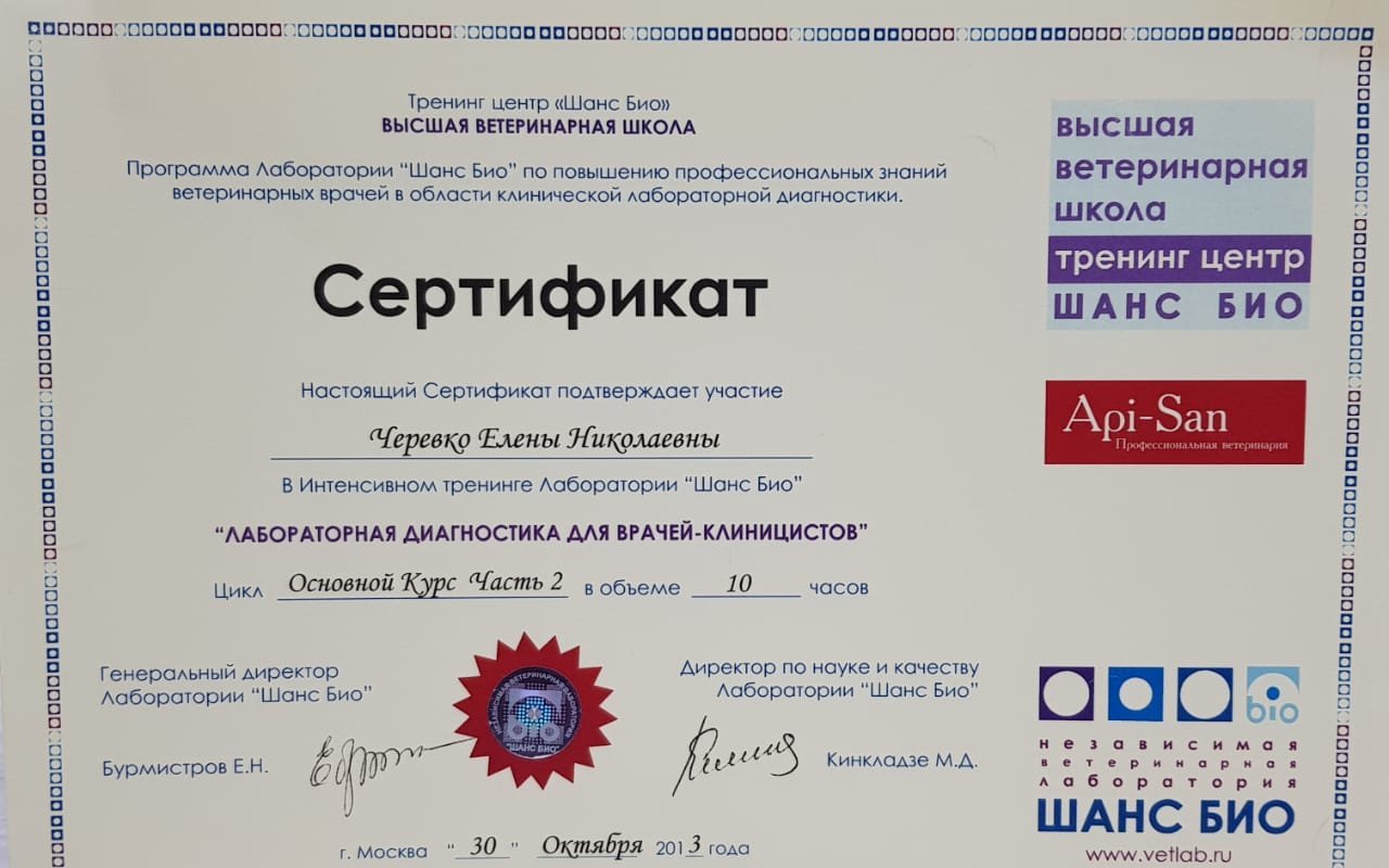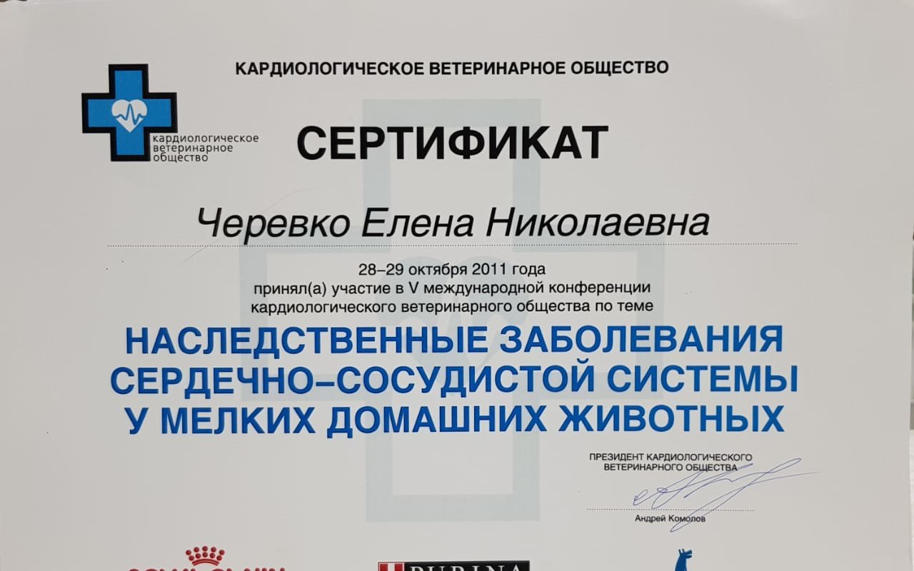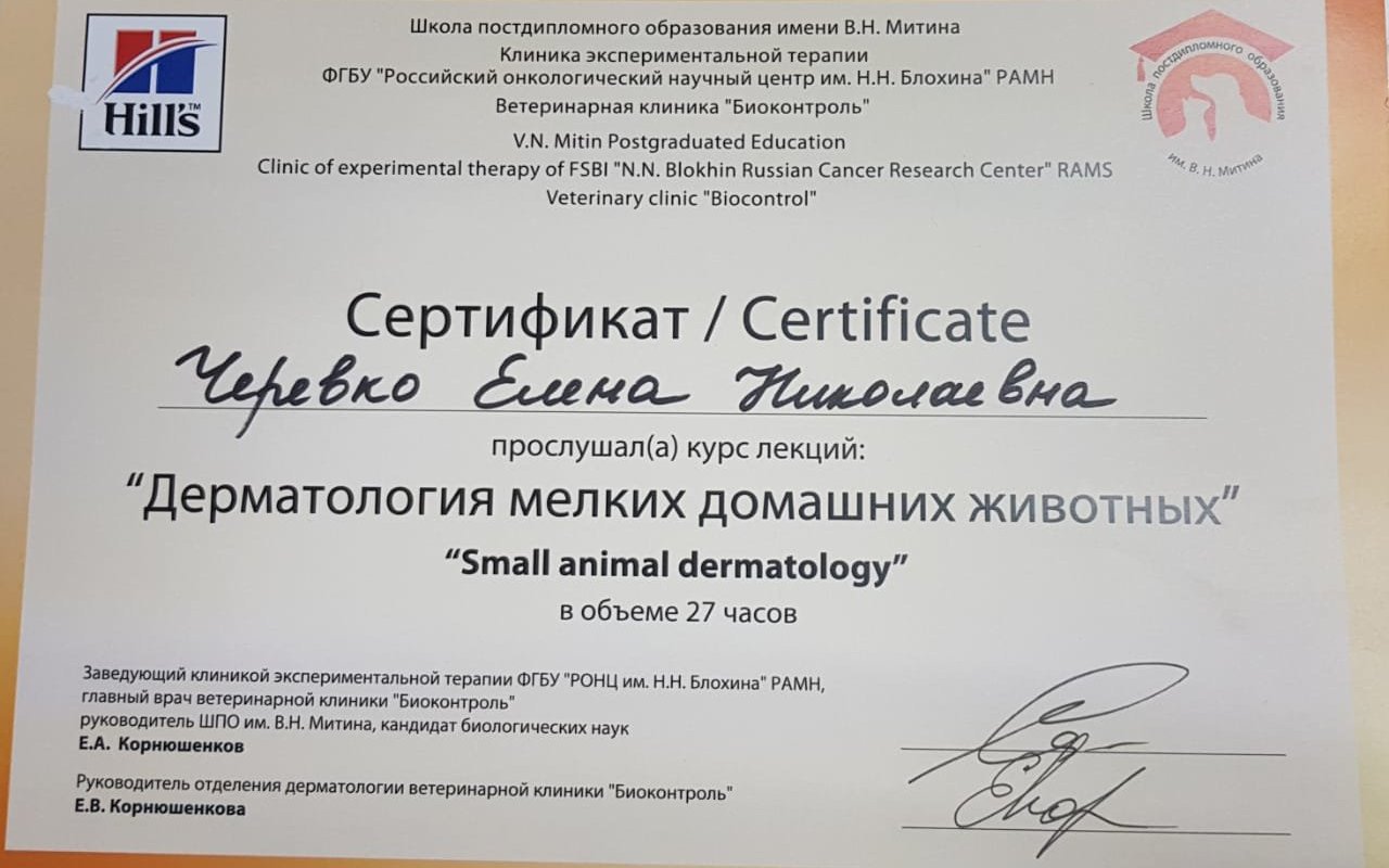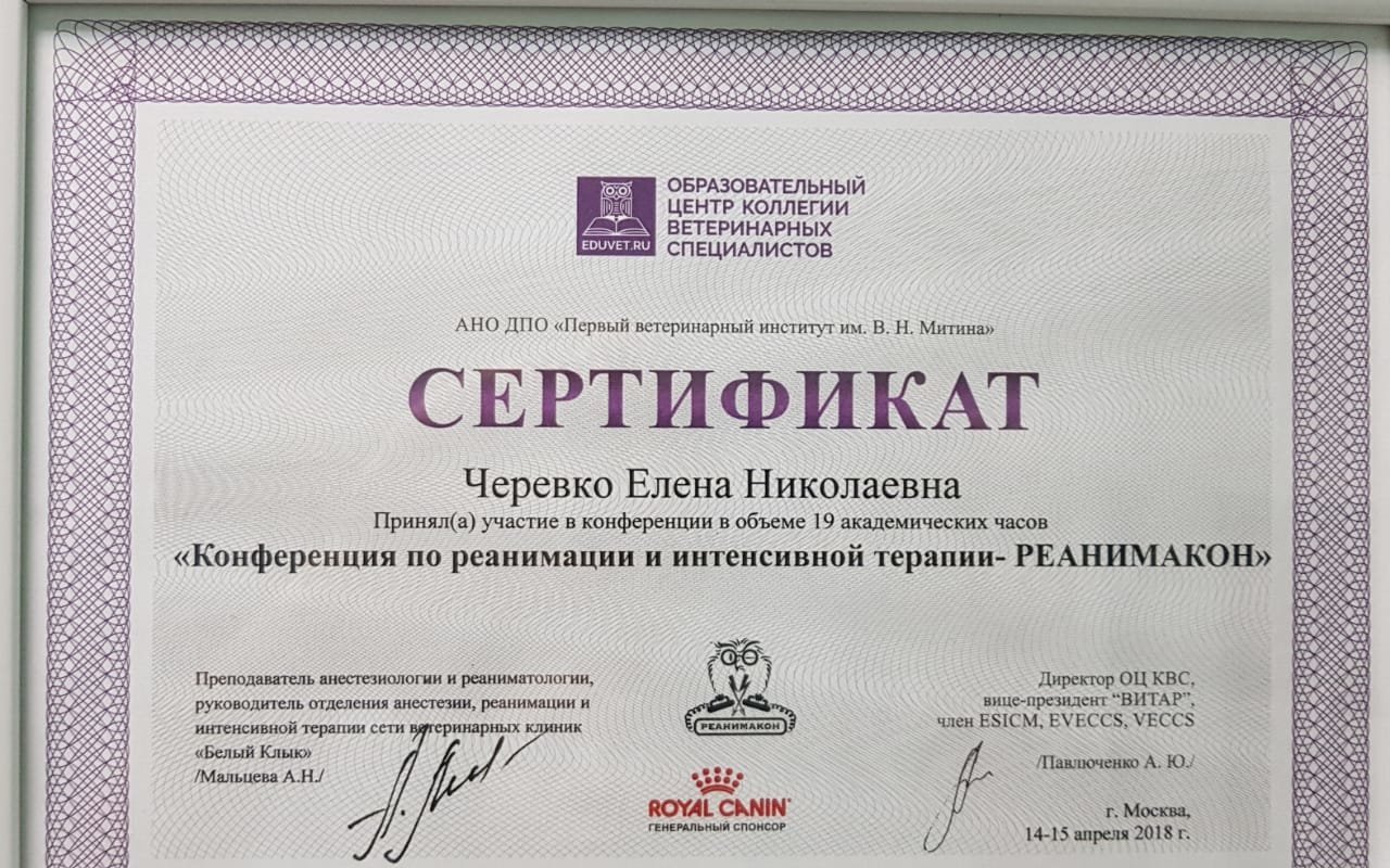 Регулярно прохожу курсы повышения квалификации в ветеринарных клиниках «Белый Клык», «Биоконтроль», «Медвет» и посещаю ветеринарные конгрессы