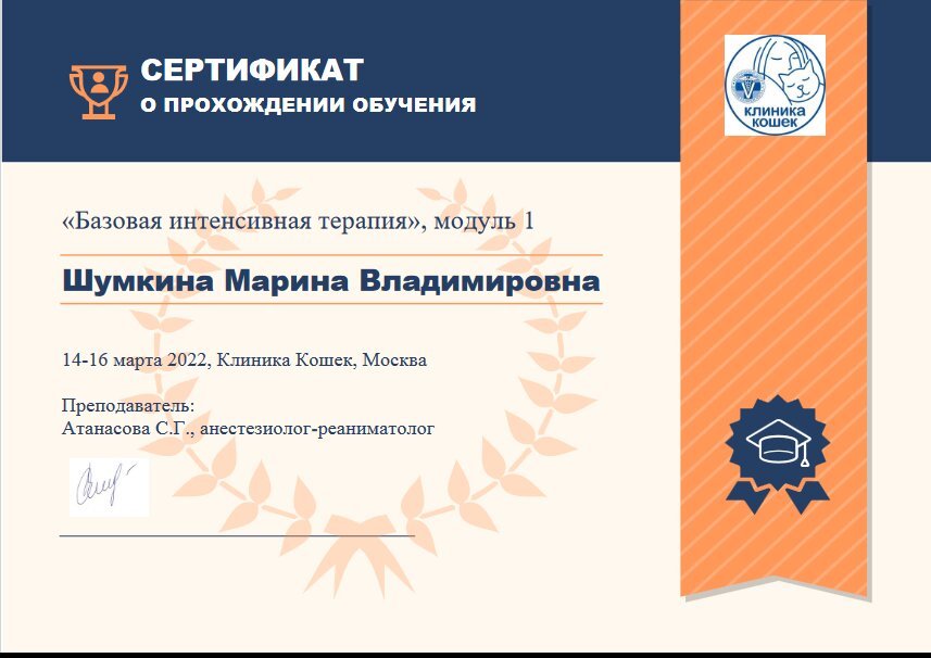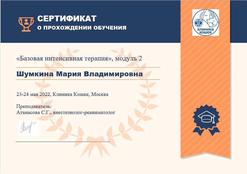 2017 — Клиника экспертной терапии ФГБНУ "Российский онкологический научный центр им. Н.Н.Блохина", Ветеринарная клиника "Биоконтроль", Школа постдипломного образования им. В.Н. Митина, Сертификационный цикл "Ультразвуковая диагностика заболеваний мелких домашних животных"