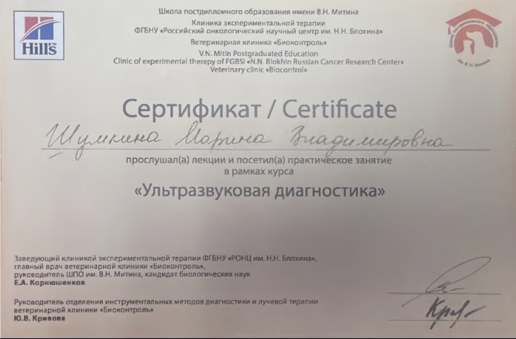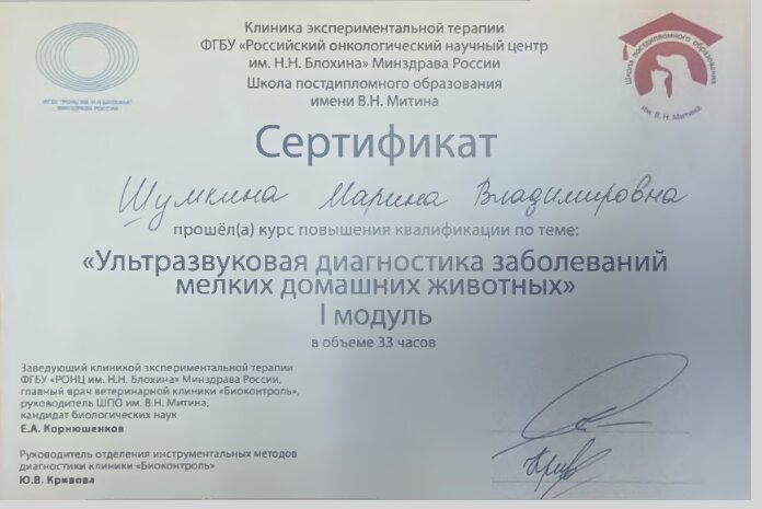 2015 — Клиника экспертной терапии ФГБНУ "Российский онкологический научный центр им. Н.Н.Блохина", Ветеринарная клиника "Биоконтроль", Сертификационный цикл "Ультразвуковая диагностика"