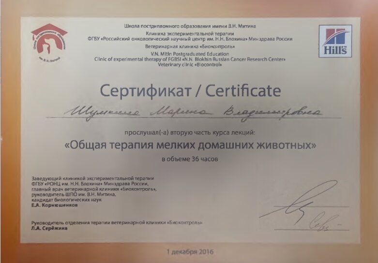 2016 — Клиника экспертной терапии ФГБНУ "Российский онкологический научный центр им. Н.Н.Блохина", Ветеринарная клиника "Биоконтроль", Сертификационный цикл "Общая терапия мелких домашних животных"