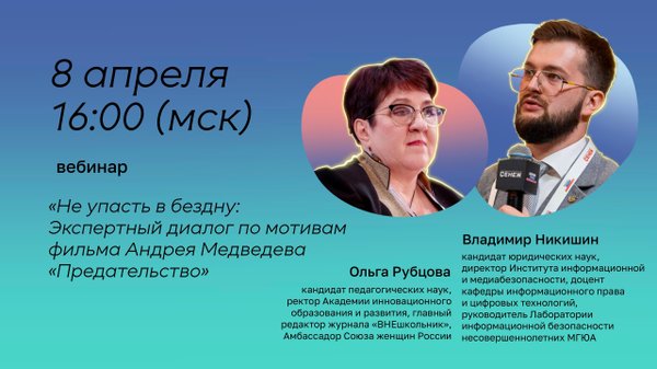 Не упасть в бездну: экспертный диалог по мотивам фильма Андрея Медведева «Предательство» 8 апреля в 16:00 по московскому времени состоится вебинар, посвященный проблеме вовлечения детей и молодёжи в противоправную и террористическую деятельность становится всё более острой для общества и государства. На основе фильма Андрея Медведева «Предательство» Амбассадор Союза женщин России Ольга Рубцова и директор Института информационной и медиабезопасности МГЮА им. О. Е. Кутафина Владимир Никишин не только обсуждают правовые последствия таких действи… — Читать дальше