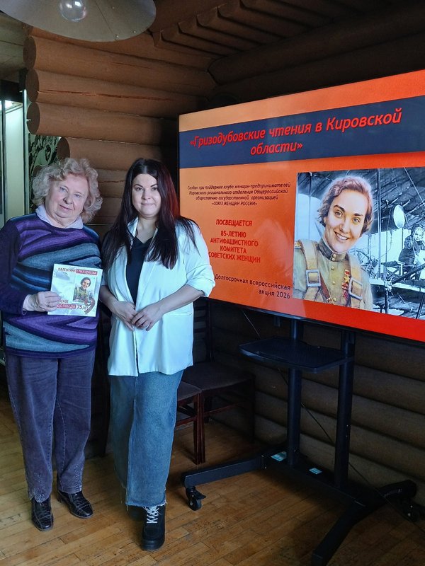 , безусловно занимает легендарная летчица, Герой Советского Союза, председатель Антифашистского Комитета советских женщин Валентина Степановна Гризодубова. Это о ней сегодня во Дворце творчества Мемориал был урок мужества — рассказ для учеников школы номер 51 города Кирова.» Затаив дыхание, ребята слушали рассказ Елены Перетягиной (член Союза женщин) и Людмилы Летягиной (педагог Музея боевой славы «ПАМЯТЬ») о подвигах В.Гризодубовой, ее подруг-летчиц во время ВОВойны, о подвигах кировчанок: Анны Дудиной, Нины Михайловны Косицкой. Экспонаты, фотографии, плакаты, книги — все напоминает о той страшной войне. Но мы выстояли, мы победили! Ольга Туева: «Это мероприятие в стенах Дворца творчества Мемориал стало символичным для меня и потому, что нахлынули воспоминания о моих школьных годах. После школы мы бежали во Дворец пионеров (ул.Коммуны, ныне Московская), где каждый выбирал для себя занятие по душе. Это время до сих пор я вспоминанию с теплотой, любовью, благодарностью. Руководители кружков, как мамы, обучали нас мастерству, знаниям и умениям. Какие только кружки я не посещала здесь (доп.образование на современном языке): рисование, кройки и шитья, вязания, хор и любимый Клуб интернациональной дружбы. Именно здесь в нас заложены патриотизм, любовь к родине и к людям! Помню и 1974 год, когда наши кружки переехали в новое здание Дворца-мемориала, мы уже были старшеклассниками, но находили время побывать в гостях у наших учителей — наставников. В память о нашей встрече подарила музею боевой славы «Память» альбом о жизни и подвигах В.С.Гризодубовой. Год 2026 — юбилейный, 85 лет Союзу женшин России! Год 2026 — юбилейный и для меня, — 30 лет в Союзе женщин!»