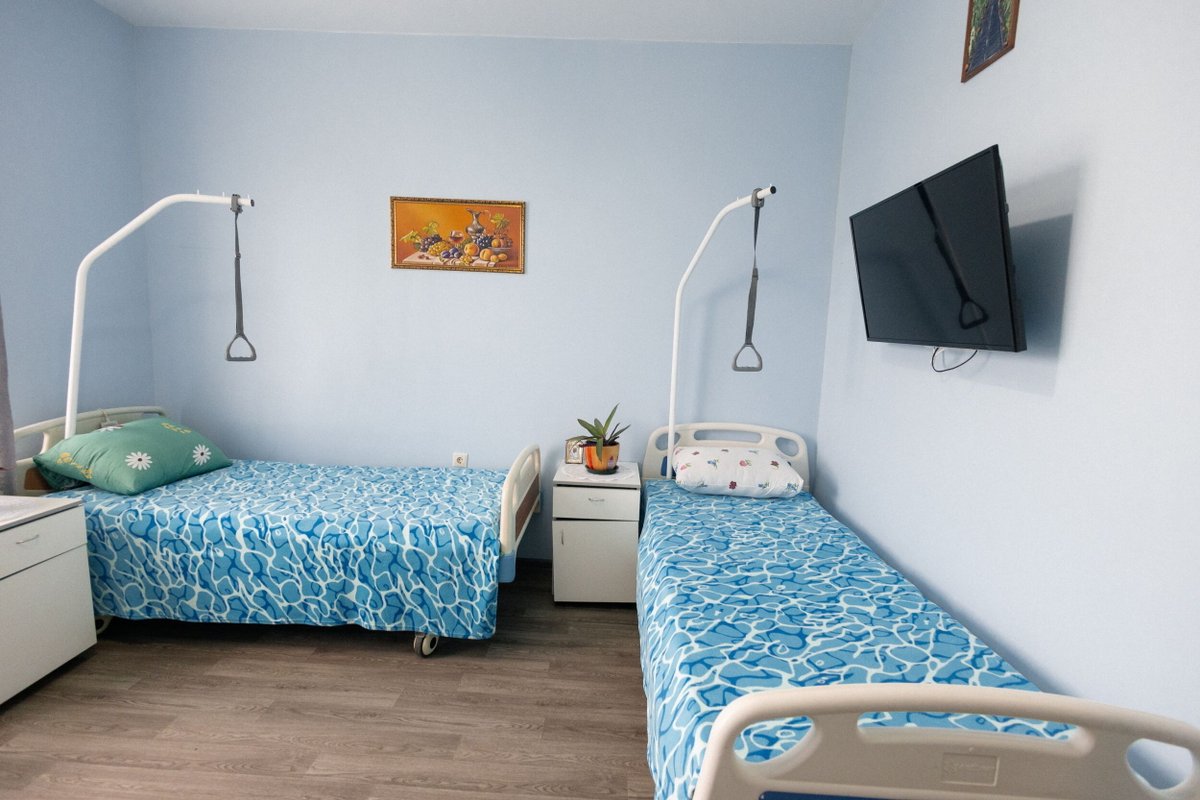 Тетя сломала шейку бедра и ей нужен был уход и покой. Дома мы бы не справились физически. Здесь есть все условия для таких больных. В душе поручни и стульчики везде пандусы. Девочки нянечки помогают ей вставать и расхаживаться с ходунками. Врач осматривает еженедельно.