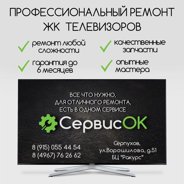 Ремонт ЖК телевизоров в СервисОК быстро и надежно! Наши контакты: или. г.Серпухов, Ворошилова 57, 2й этаж. Вход со стороны Пиццы 24. Рядом с ВСК страхование. Работаем ежедневно с 10.00 – 19.00