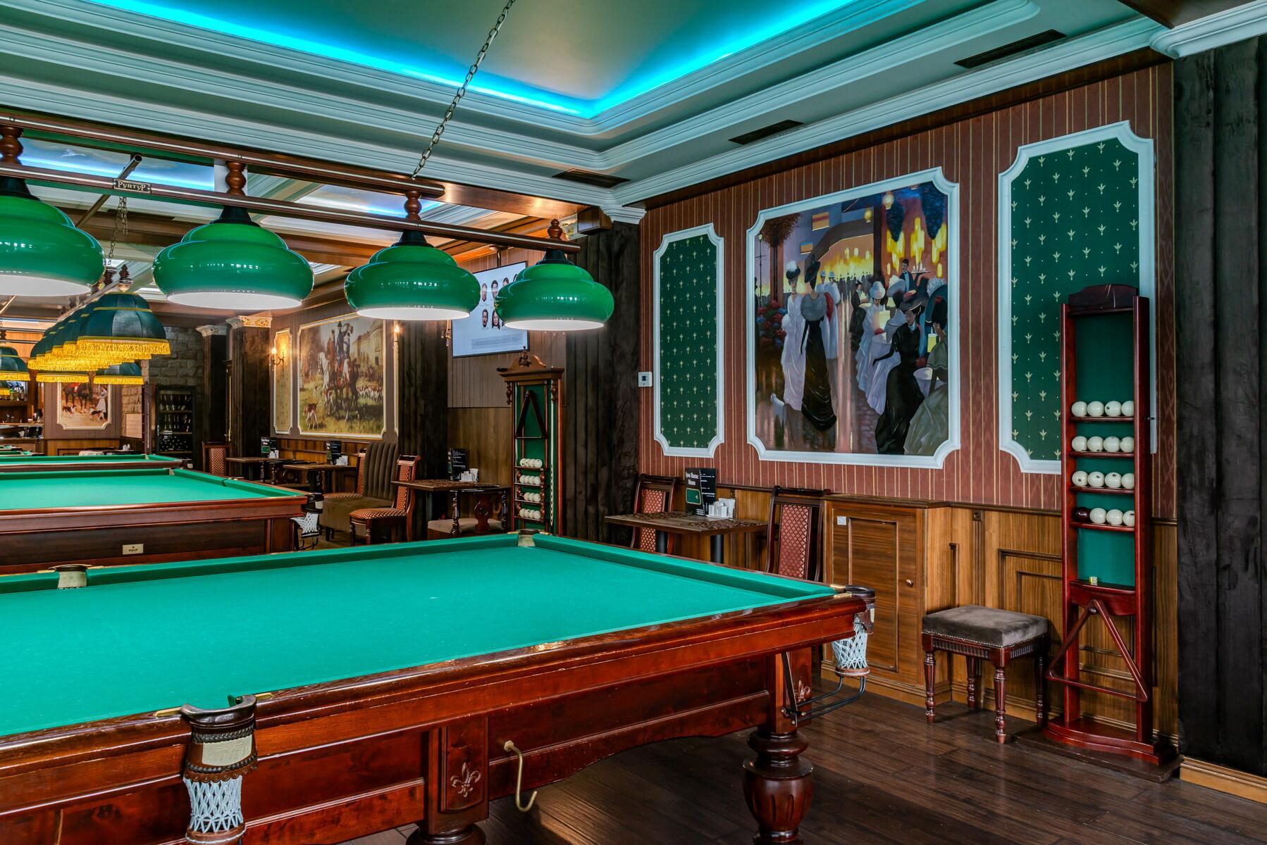 Бильярдный зал: с семью столами для игры в русский бильярд и два стола для игры в американку. Стильный интерьер гармонирует с основным залом.