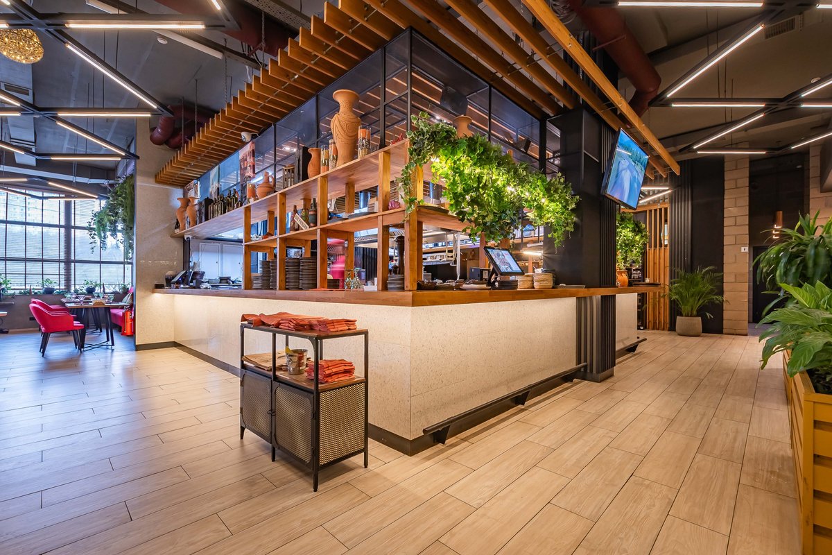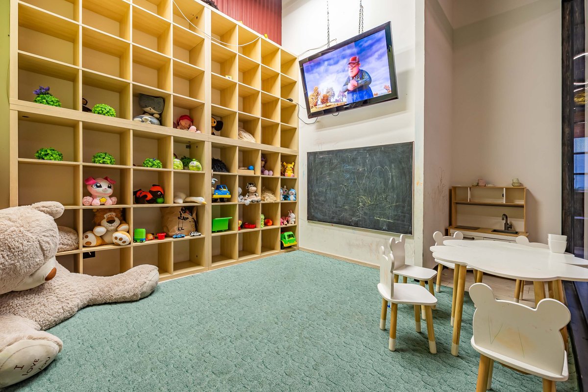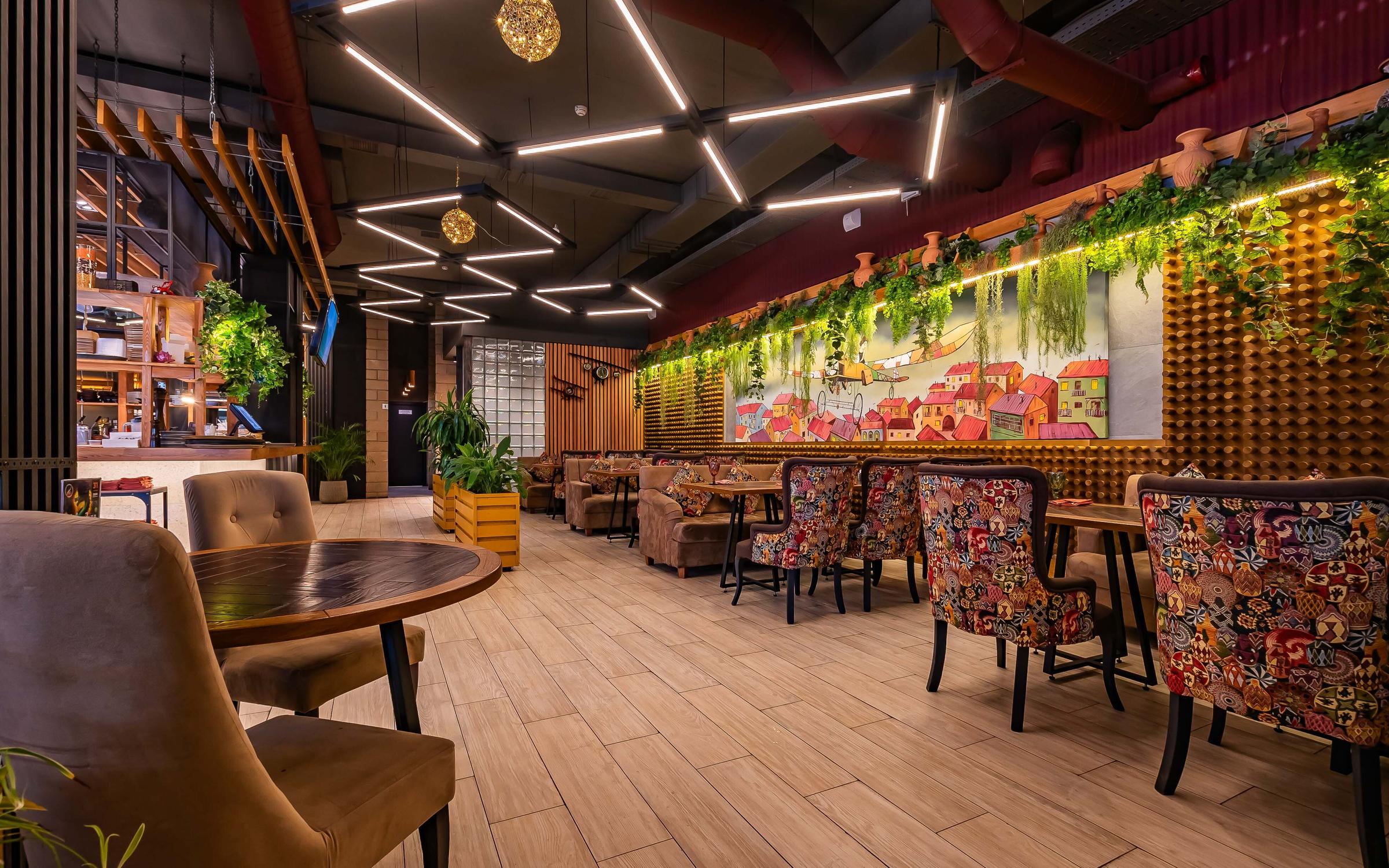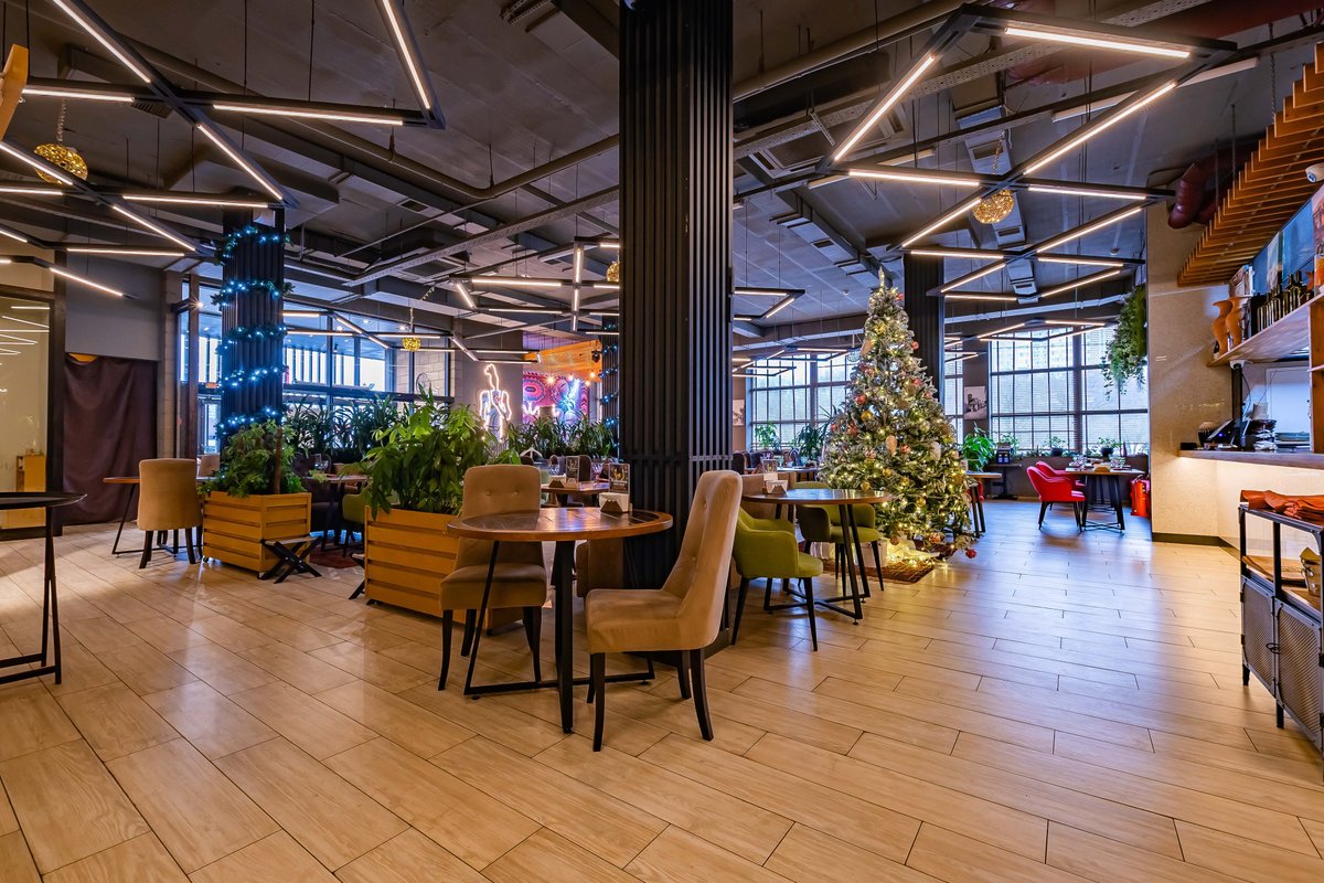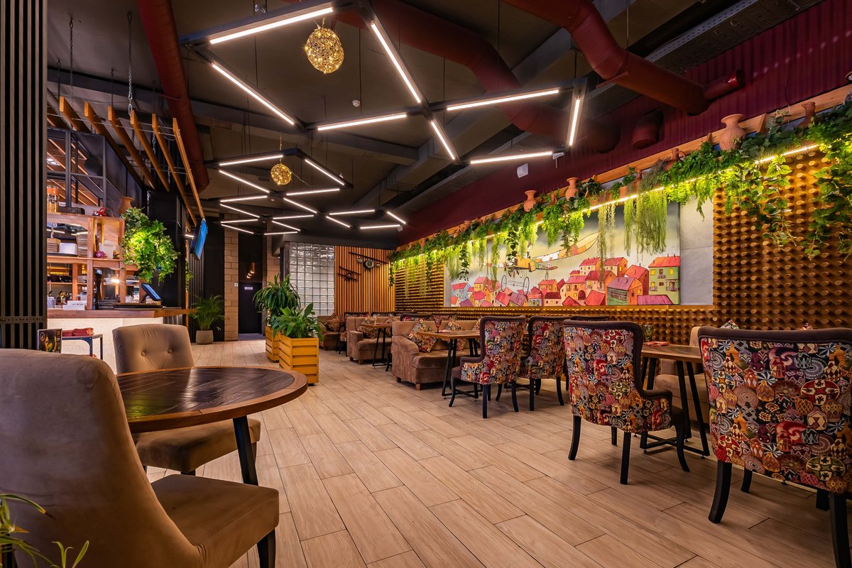 Если с вами будет малыш, здесь он сможет познакомиться и поиграть со сверстниками в специальном детском уголке. Благодаря этому он не заскучает за взрослым столом, а вам не придётся постоянно отвлекаться. Помимо этого, здесь есть терраса, вай-фай, площадка для танцев и живая музыка.
