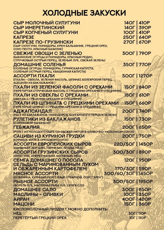 Здесь вы сможете насладиться излюбленными блюдами разных кухонь: представлена грузинская кухня, кавказская, русская, европейская, большой выбор алкоголя.