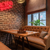 Интерьер заведения довольно уютный: стильные деревянные элементы, мягкие диваны и компоненты открытой кухни