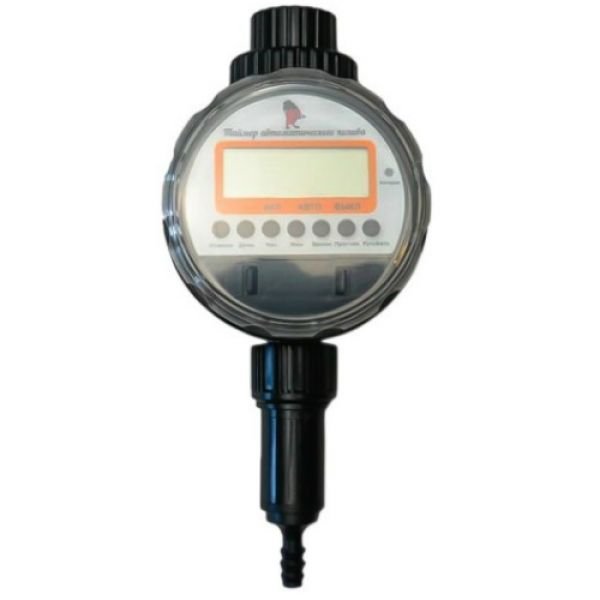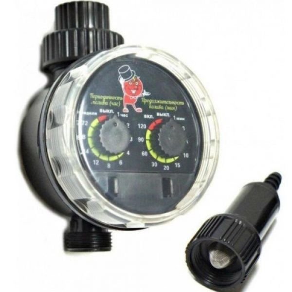 Тип таймера - механический. Блок управления - 2 поворотных ручки и кнопка. Частота полива - от 1 часа...