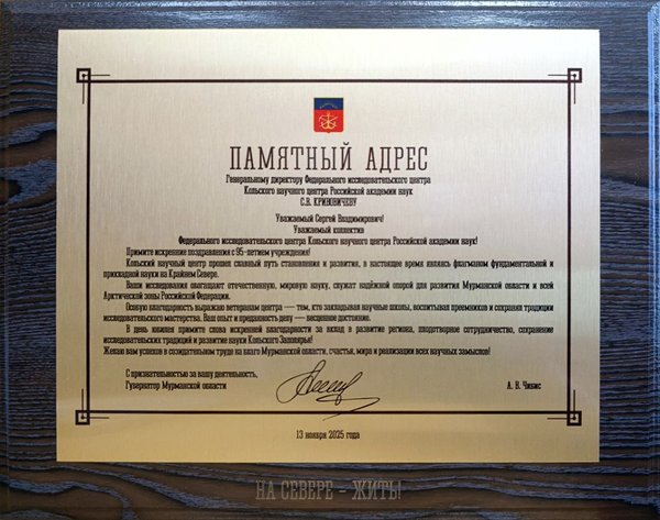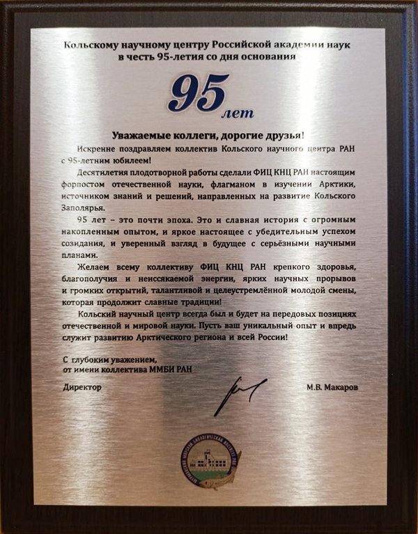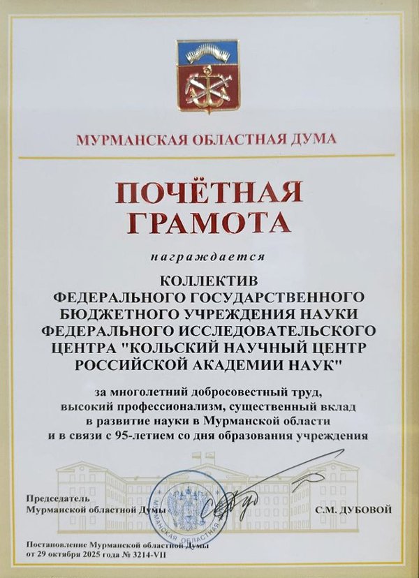 анял традиции исследовательского мастерства. Ваш опыт и преданность делу — бесценное достояние. В день юбилея примите слова искренней благодарности за вклад в развитие региона, плодотворное сотрудничество, сохранение исследовательских традиций и развитие науки Кольского Заполярья! Желаю вам успехов в созидательном труде на благо Мурманской области, счастья, мира и реализации всех научных замыслов! С признательностью за вашу деятельность, губернатор Мурманской области А.В. Чибис». Губернатор наградил весь наш коллектив почетной грамотой за многолетний добросовестный труд, высокий профессионализм, значительный вклад в развитие отечественной науки в Арктической зоне Российской Федерации и и в связи с 95-летием со дня основания Кольского научного центра Российской академии наук. Спасибо вам, коллеги, это общая заслуженная награда!