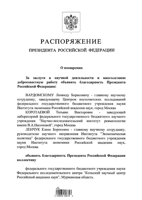 9 апреля президент Российской Федерации Владимир Путин подписал распоряжение № 113-рп о поощрении научных коллективов и выдающихся деятелей науки. За заслуги в научной деятельности и многолетнюю добросовестную работу благодарность президента РФ объявлена коллективу Кольского научного центра РАН. Поздравляем, коллеги!