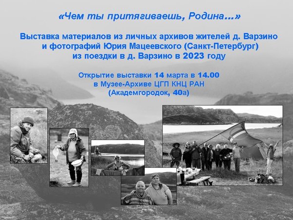 ория семьи. Это не просто воспоминания – это живая связь поколений, способ не дать памяти умереть вместе со стенами домов. Приглашаем вас прикоснуться к этой памяти на выставке «Чем ты притягиваешь, Родина » в Музее-Архиве истории изучения и освоения Европейского Севера Центра гуманитарных проблем Баренц-региона КНЦ РАН. В экспозиции представлены материалы из личных архивов жителей деревни Варзино, а также фотографии Юрия Мацеевского (Санкт-Петербург), сделанные в 2023 году. Открытие выставки состоится 14 марта в 14 часов. Место проведения: Апатиты, Академгородок, 40а.