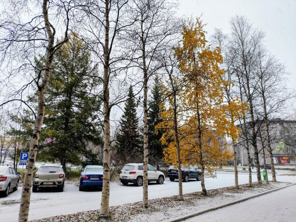 я относительно того, что же решили тогда озеленители, но нам больше нравится такая версия: сюда оперативно добавили деревце, которое просто оказалось в тот момент под рукой, а именно березу повислую. Это представитель другого вида берез, да еще и не адаптированный как следует к условиям Севера. И сейчас, в момент первого снега, мы наблюдаем в буквальном смысле, как растение «не понимает», что зима близко! Еще множество интересных деталей о природе Академического городка вы почерпнете здесь, а виртуальный тур в любое время года по нему совершите тут