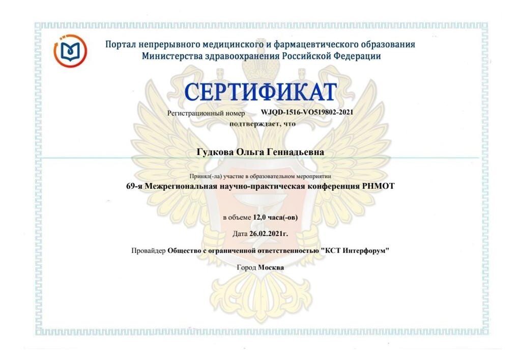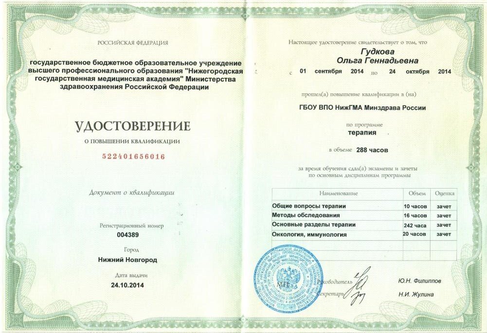 2019 г. — Повышение квалификации в ФГБОУ ВО «ПИМУ» Минздрава России по специальности "Терапия"