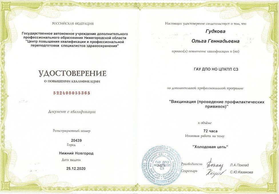 2020 г. — Повышение квалификации в Центре повышения квалификации и профессиональной переподготовки специалистов здравоохранения по программе «Вакцинация (проведение профилактических прививок)»