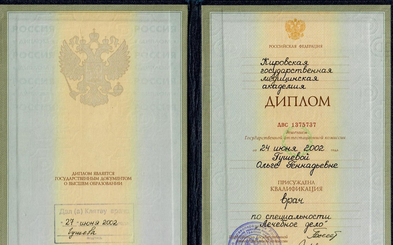 2002 г. — Высшее в КГМА (Кировская Государственная медицинская академия) по специальности "Лечебное дело"