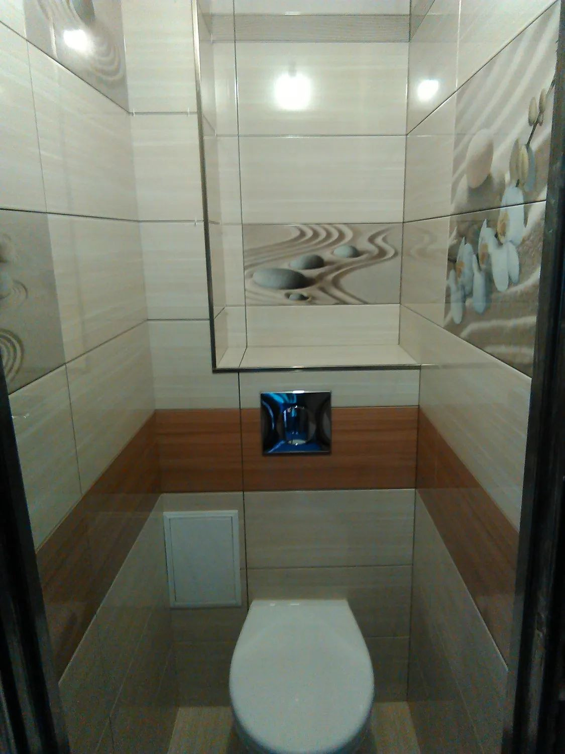 Санузел малогабаритный, сложной формы. Судя во виду стены с рождения только красились и белились. После работы мастера получилась практически идеальная конфетка.