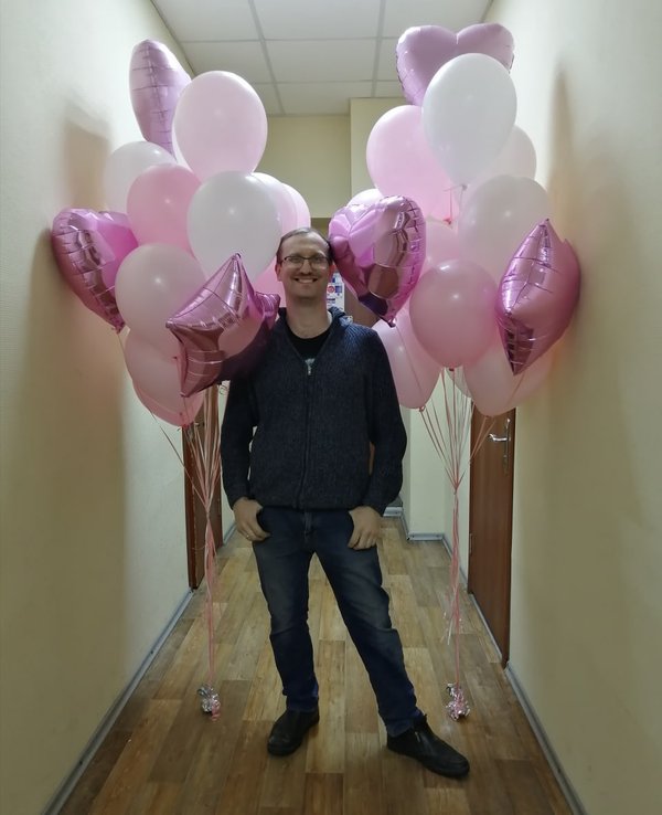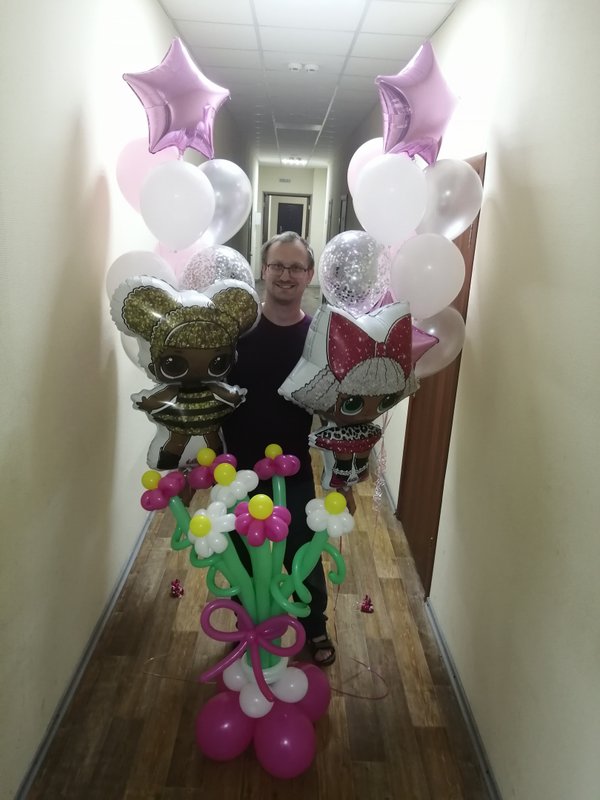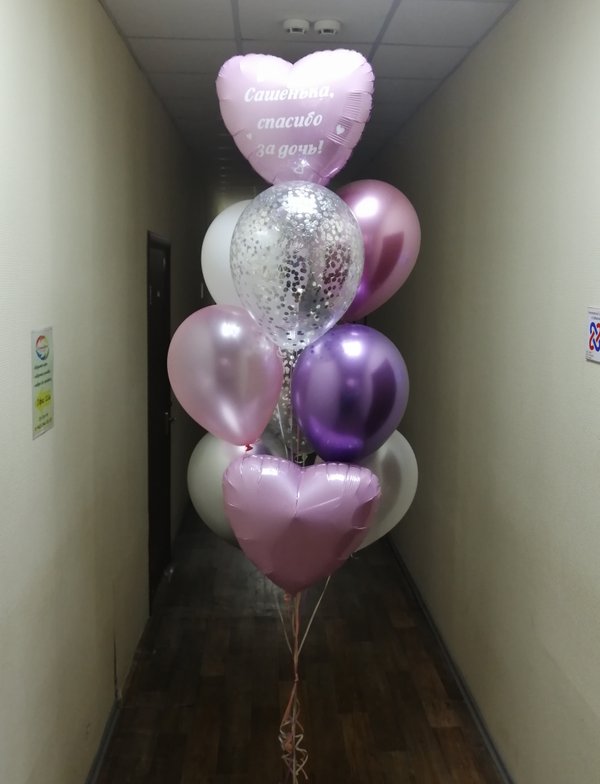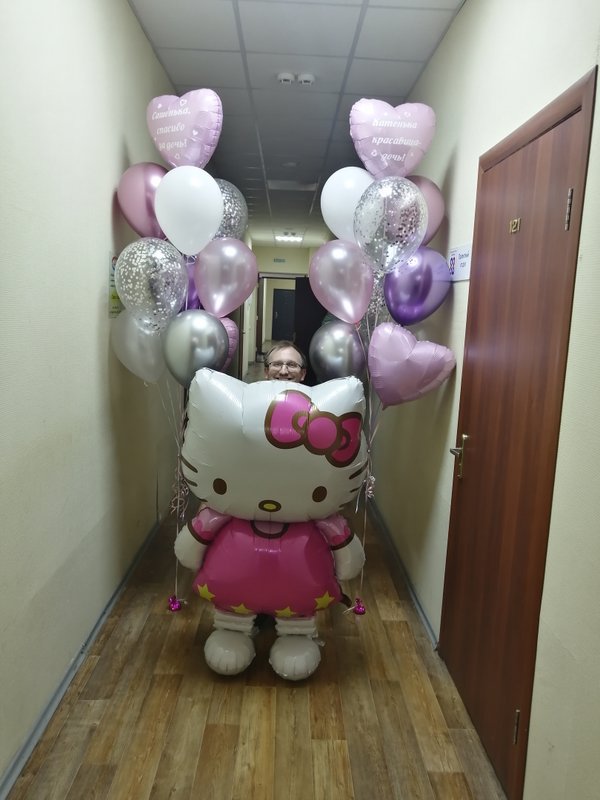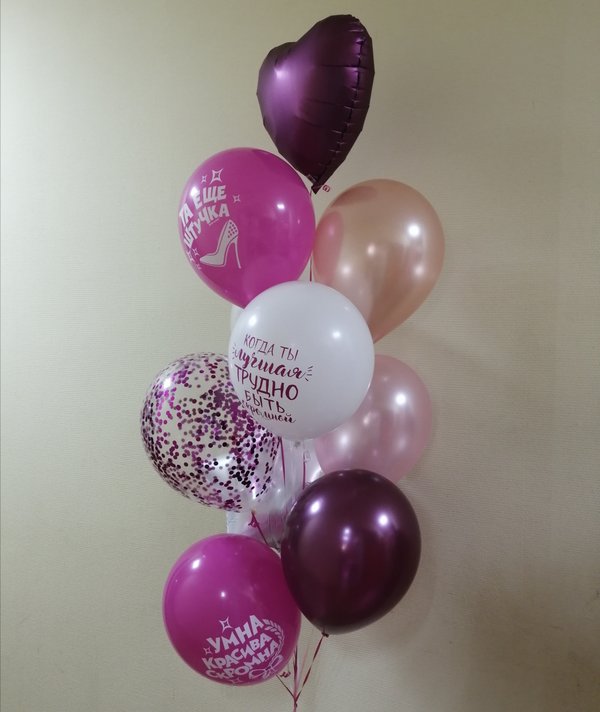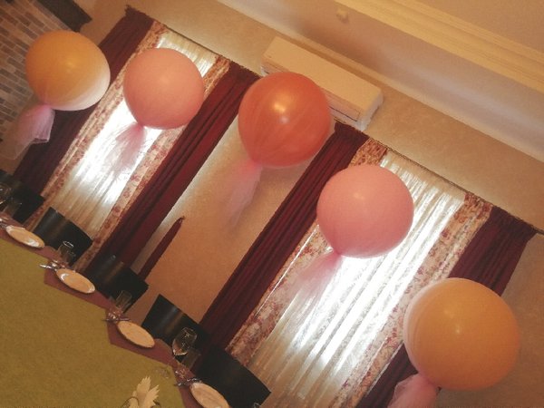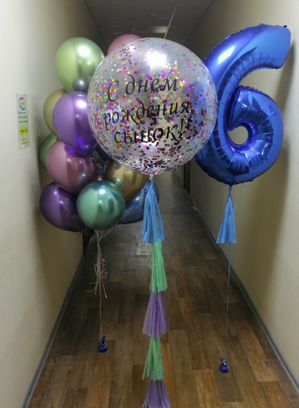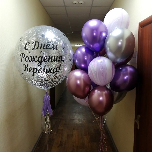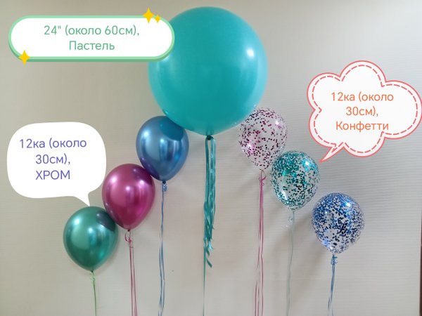 Чем интересно данное фото? Просто на нем присутствуют разные виды и размеры шаров. Видно, чем хром отличается от шара пастель, как выглядят шары с конфетти. Также визуально четко видно насколько шар 24 дюйма отличается от обычной 12ки (и сколько в него может уйти гелия).