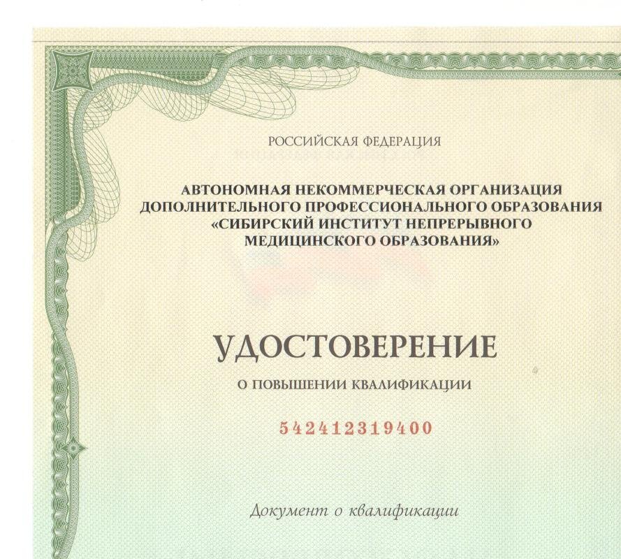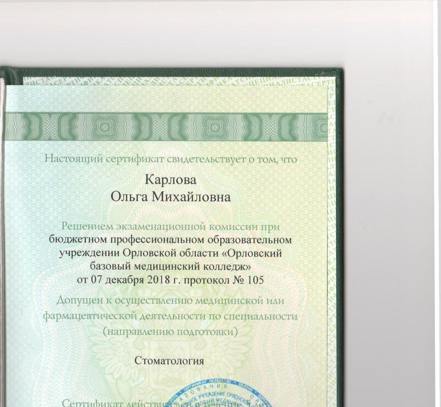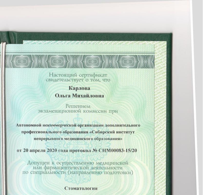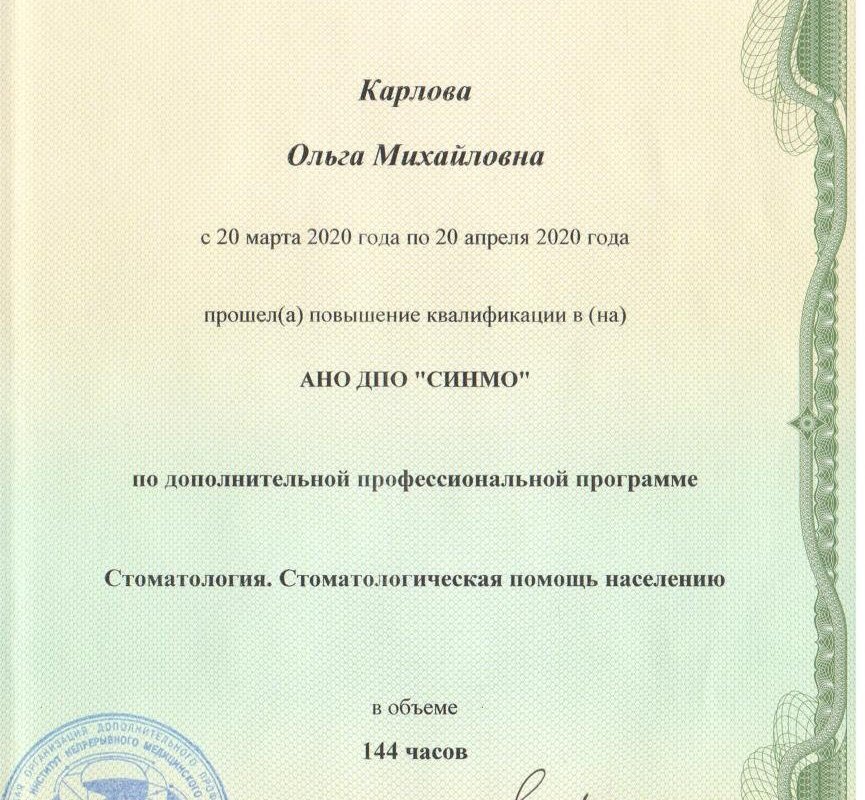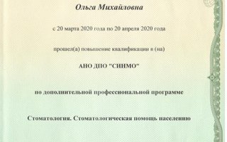 • Курс повышения квалификации по специальности «Стоматология», время окончания март 2020г., срок действия сертификата – 5 лет