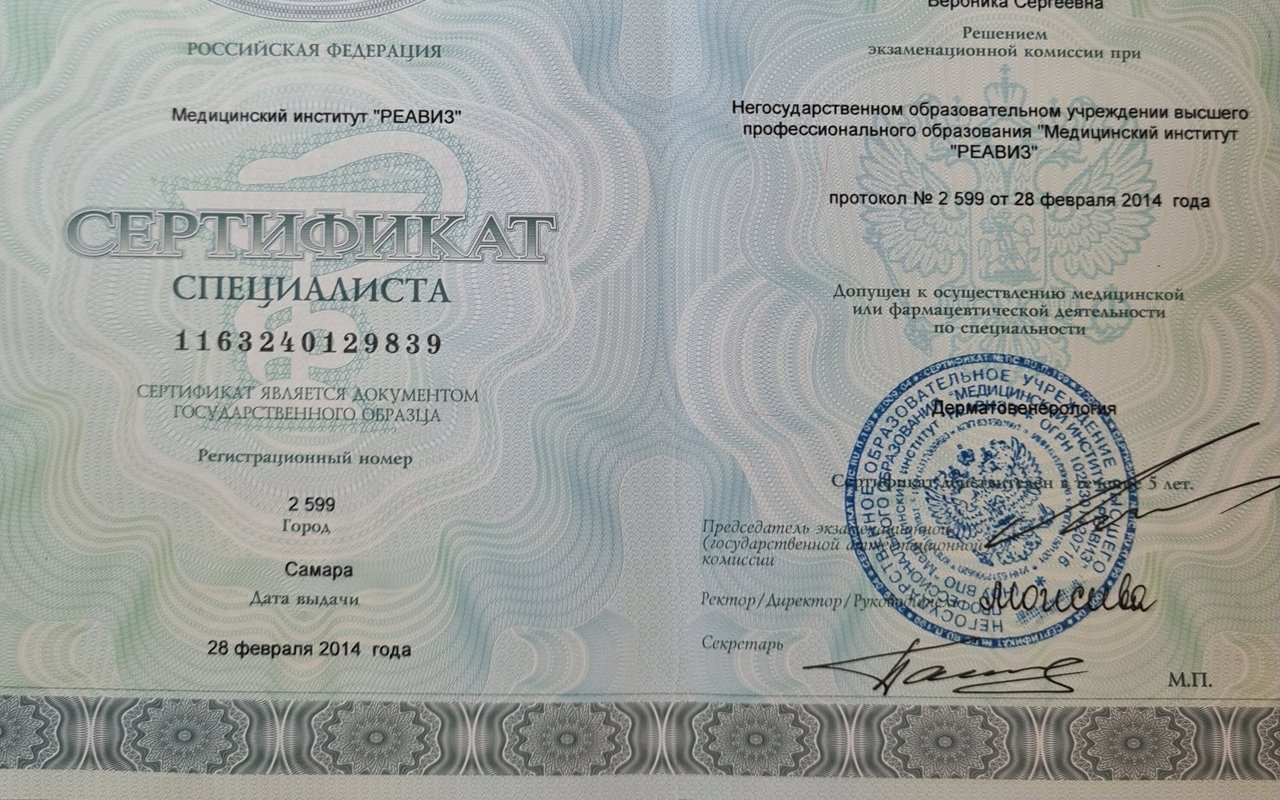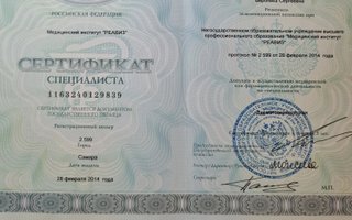 2014 — Прошла интернатуру по дерматовенерологии и специализацию по профессиональной косметологии в Самарском медицинском институте «Реавиз»