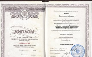 2015 — Клиническая интернатура по специальности "Дерматовенерология", Оренбургская государственная медицинская академия Федерального агентства по здравоохранению и социальному развитию.