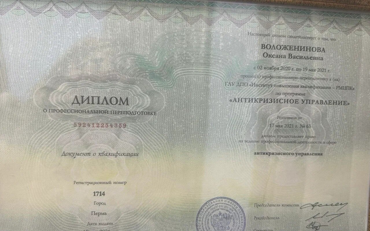 02.11.2020–19.05.2021 — Диплом о профессиональной переподготовке "Антикризисное управление", г. Пермь, ГАУ ДПО "Институт повышения квалификации - РМЦИК"