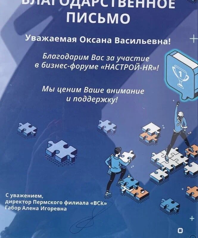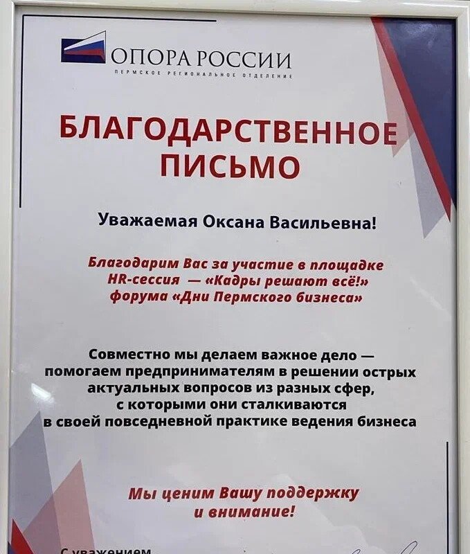 Благодарственное письмо за участие в бизнес-форуме "Настрой-HR"