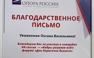 Благодарственное письмо за участие в площадке HR-серия "Кадры решают всё!" форума "Дни Пермского бизнеса"