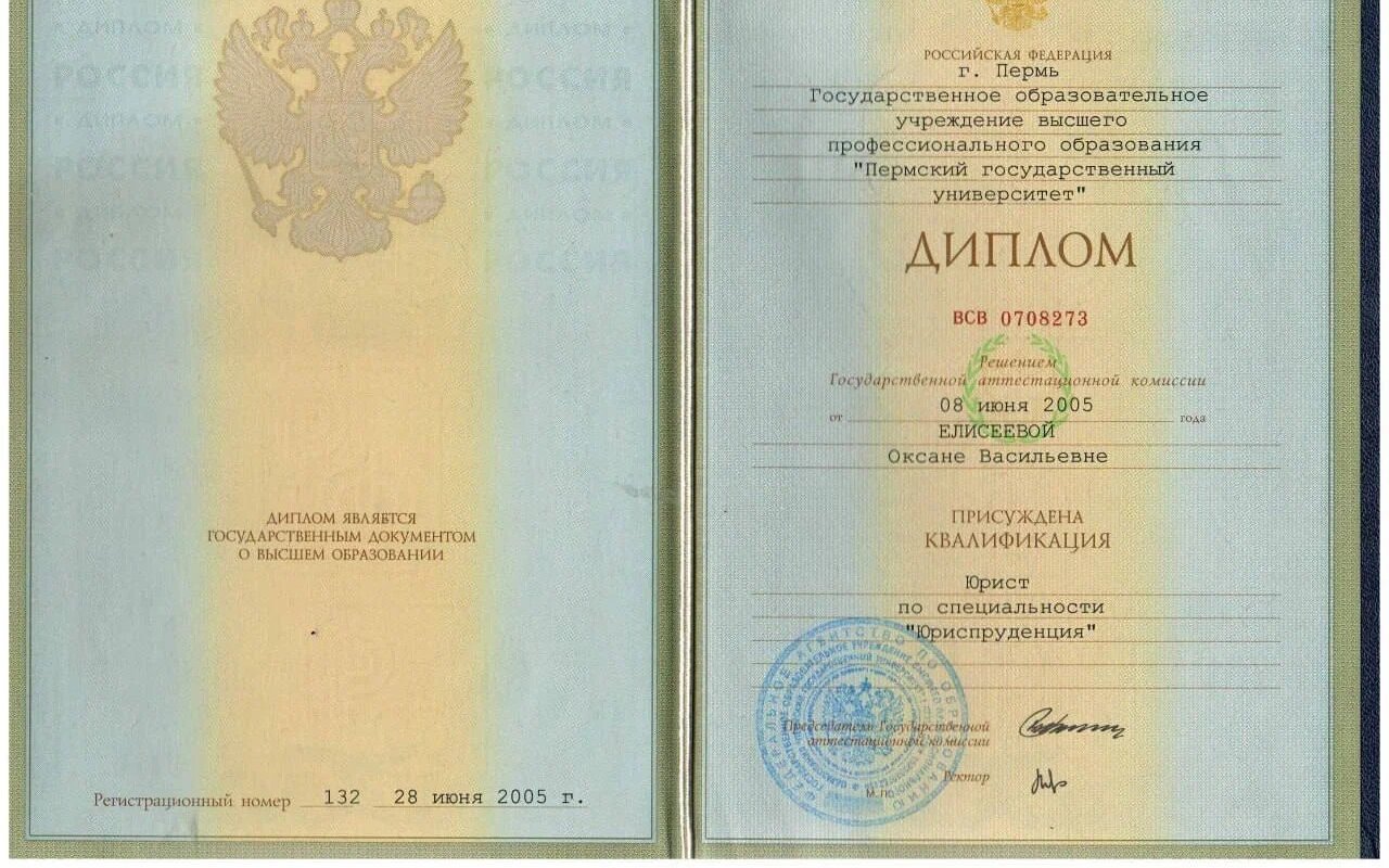 2005 — Высшее образование, Диплом: Юрист по квалификации "Юриспруденция", г. Пермь Государственное образовательное учреждение высшего профессионального образования "Пермский государственный университет"р