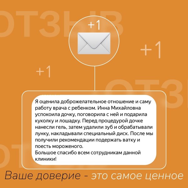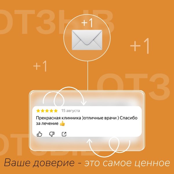 Ваши отзывы — наша лучшая мотивация! Каждый отзыв помогает нам становиться лучше, вдохновляет команду и помогает другим выбрать нас. Спасибо, что доверяете нам свою улыбку! Отзыв можно оставить в группе, в нашей клинике или на Яндекс картах