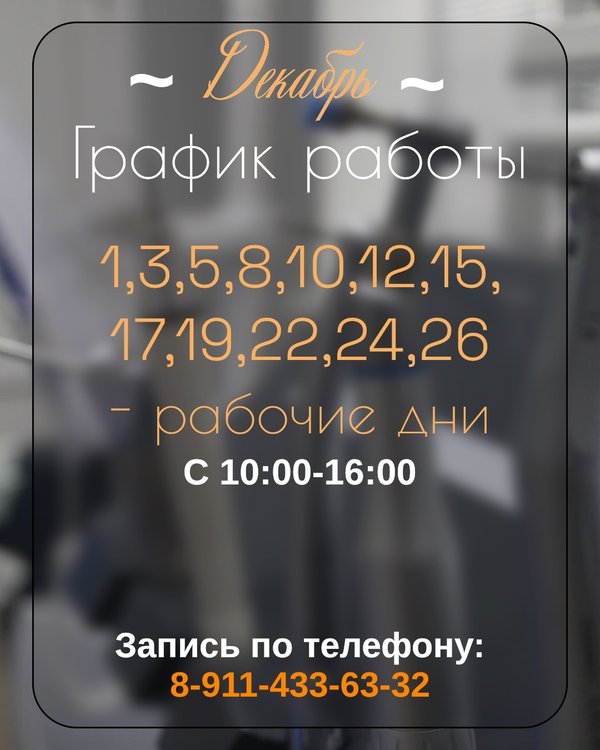 ️ Декабрь в нашей клинике: важная информация! ️ В этом месяце у нас небольшой график работы – один из наших врачей берет заслуженный отпуск. Но не волнуйтесь, мы подготовили удобные для вас даты, чтобы вы могли записаться на приём и не откладывать заботу о своей улыбке! Дни приёма в декабре: 1,3,5,8,10,12,15,17,19,22,25,26 Записаться просто – звоните!