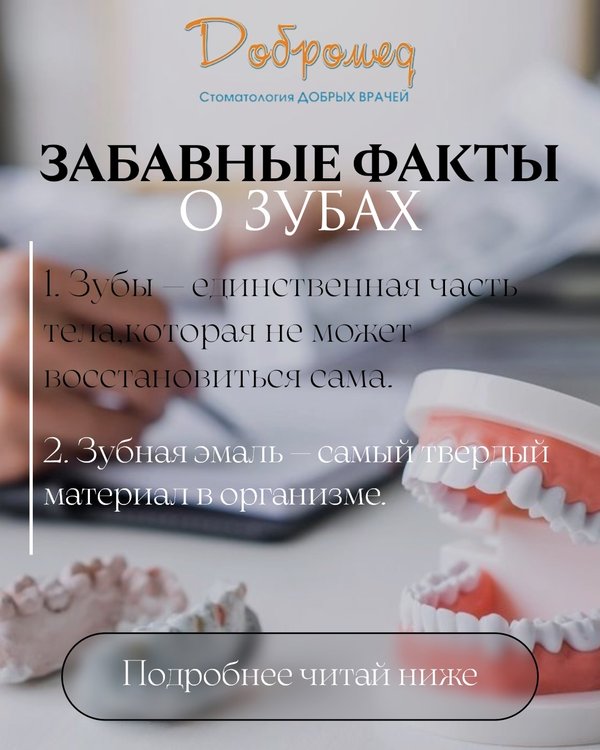 Забавные факты о зубах, которые вас удивят! 1️⃣ Зубы — это единственная часть тела, которая не может восстановиться сама. Поэтому так важно следить за их состоянием и регулярно посещать стоматолога! 2️⃣ У человека 32 зуба, но у современного человека их может быть меньше. Многие люди теряют зубы из-за кариеса или других стоматологических проблем. Поэтому заботьтесь о своей улыбке! 3️⃣ Зубная эмаль — это самый твердый материал в организме, даже прочнее костей! Но она может быть подвержена разрушению от кислоты, содержащейся в пищевых продуктах,… — Читать дальше