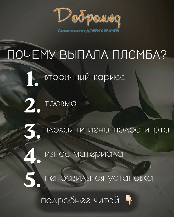 Почему выпала пломба? Узнайте основные причины! Пломбы – это наши верные защитники зубов, но иногда они могут нас подвести. Вот несколько распространенных причин, почему пломба может выпасть: 1️⃣ Кариес под пломбой: Если кариес снова «атакует» зуб, это может привести к тому, что пломба не сможет удержаться на месте. 2️⃣ Травмы: Механическое воздействие, например, от случайного удара, может повредить пломбу. 3️⃣ Неправильная гигиена: Недостаток ухода за зубами приводит к образованию налета и кариеса, что также может испортить пломбу. 4️⃣ Износ… — Читать дальше