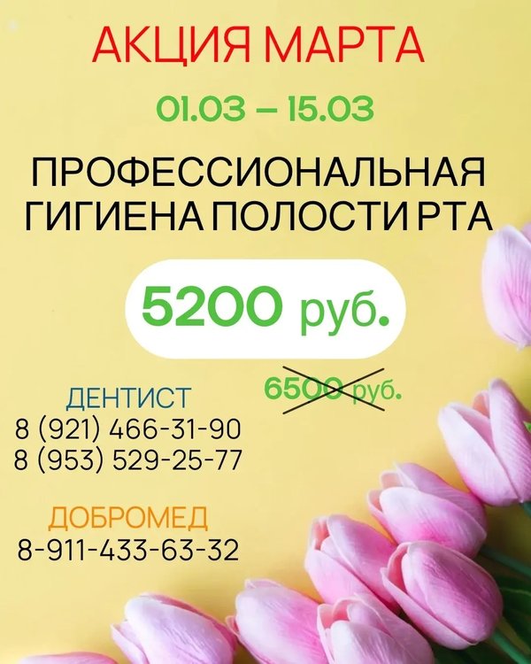 Дорогие пациенты, у нас для вас отличная новость! Давно не было акций — и вот мы рады порадовать вас специальным предложением! Только сейчас профессиональная чистка зубов всего за 5200 рублей! Подарите себе заботу и внимание, которых вы достойны. Запишитесь на процедуру и сделайте свою улыбку ещё краше! ДЛЯ ЗАПИСИ: г.Сегежа, ул Советская, 6