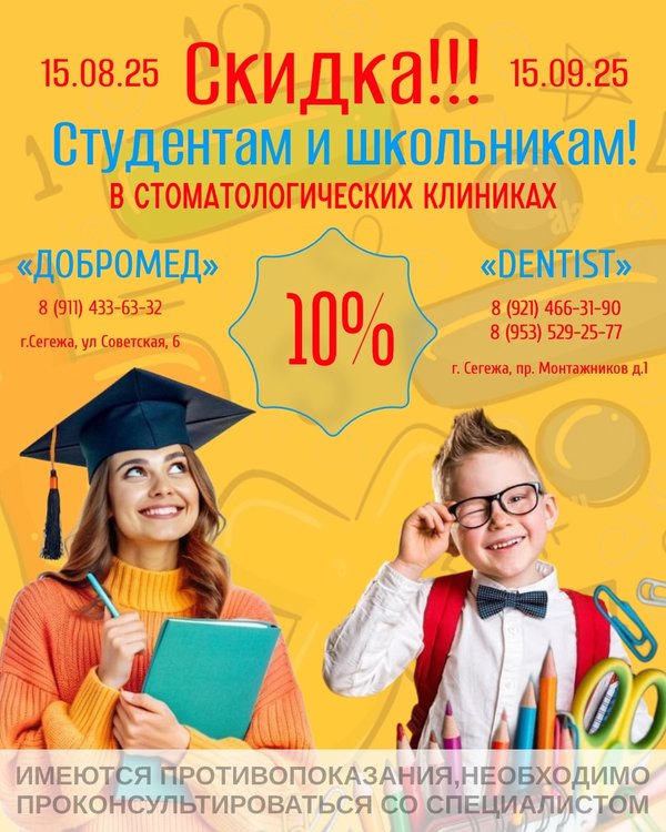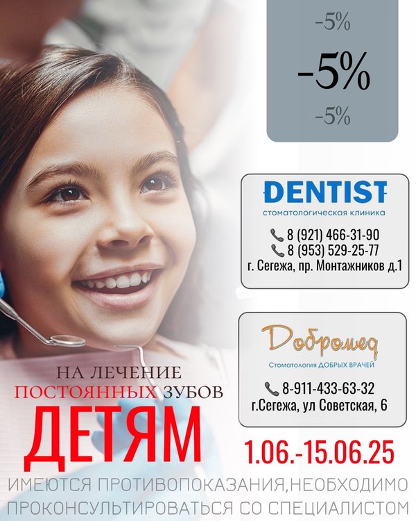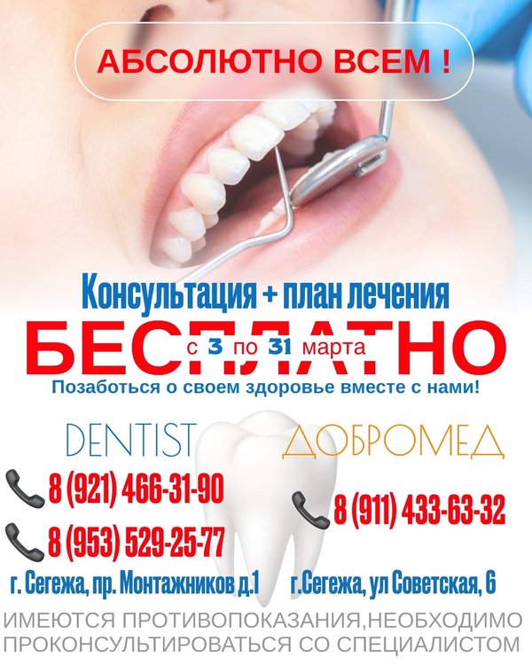 ание и просьбу: пожалуйста, не звоните администратору с вопросами о досрочном возвращении врача — отпуск строго по графику и отменам не подлежит. После отпуска Ваш врач вернется с новыми силами, чтобы продолжать заботиться о вашей улыбке! Забота о здоровье зубов — это легко, когда всё планируется заранее! Успейте записаться и сохраните свою улыбку яркой. Не упустите шанс позаботиться о здоровье зубов заранее! Звоните и записывайтесь прямо сейчас — пусть улыбка будет всегда идеальной! ДЛЯ ЗАПИСИ: г.Сегежа, ул Советская, 6