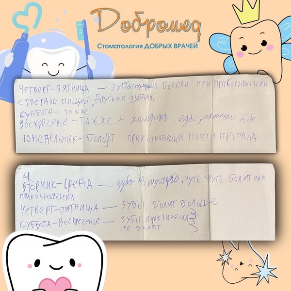 а мальчику задание: записать, как себя чувствуют зубки после лечения. На следующем приёме мальчик пришёл со своими записями, в которых детально описал, как его зубы постепенно начали восстанавливаться! Такие моменты показывают, как важно заботиться о здоровье зубов и вовремя обращаться к профессионалам. Мы гордимся тем, что смогли помочь нашему маленькому другу, и рады, что он оказался таким внимательным пациентом! Напоминаем всем родителям: не забывайте про регулярные визиты к стоматологу! Зубки – это не только красиво, но и очень важно для здоровья. До новых встреч в нашей клинике! ДЛЯ ЗАПИСИ : г.Сегежа, ул Советская, 6