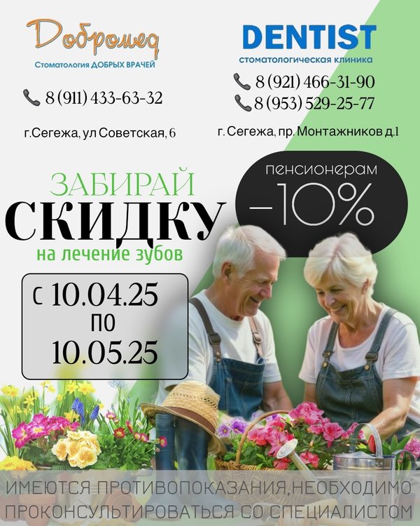 Дорогие пациенты! Спешим сообщить вам отличную новость! У нас АКЦИЯ – 10% скидка на лечение зубов для пенсионеров! ️ ПРИ ПРЕДЪЯВЛЕНИЕ ПЕНСИОННОГО ️ Почему это важно? Лето не за горами, и дачный сезон уже близко! Подготовьте свое здоровье заранее, чтобы наслаждаться посадкой и сбором урожая без лишних забот о зубах. Здоровые зубы – залог хорошего настроения и качественной пищи! Не упустите возможность позаботиться о своем здоровье по приятной цене. Запишитесь на консультацию уже сегодня, и давайте вместе сделаем вашу улыбку ярче! Заботь… — Читать дальше