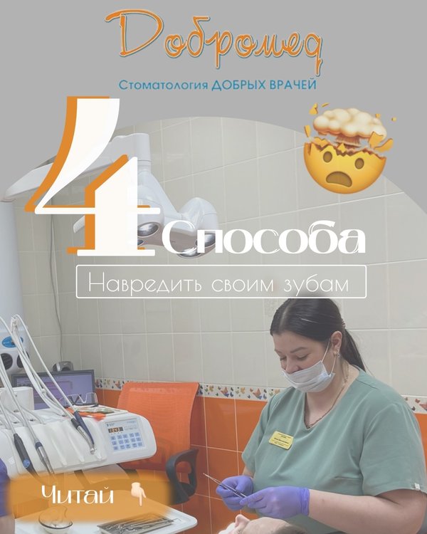 бами. Пропуск чистки зубов — большая ошибка! Рекомендуется чистить зубы дважды в день и не забывать про нить и ополаскиватель. Регулярные визиты к стоматологу также помогут предотвратить серьезные проблемы. 3️⃣ Использование зубов не по назначению. Открытие бутылок, разрывание упаковок и даже использование зубов как инструментов могут привести к повреждению эмали и даже переломам. Лучше использовать ножницы или открывалку! 4️⃣ Курение и злоупотребление алкоголем. Эти привычки не только ухудшают здоровье зубов и десен, но и могут привести к их потере. Отказ от курения и moderation в употреблении алкоголя станут залогом крепких зубов! Заботьтесь о своих зубах, и они ответят вам яркой улыбкой!