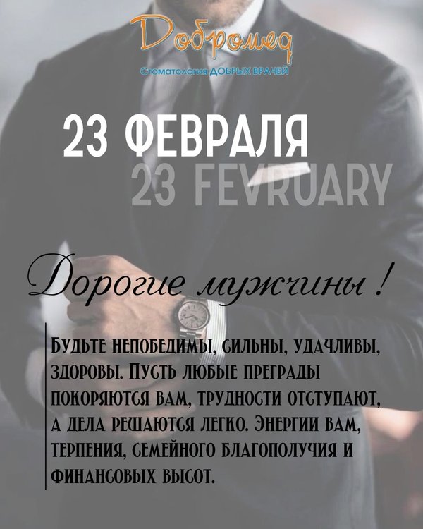 Дорогие наши пациенты! С 23 февраля, с Днём защитника Отечества! Хотим поздравить всех мужчин и наших дорогих пациентов! Вы – настоящие защитники в нашей жизни. Ваша сила, ответственность и забота о близких – это те качества, которые делают вас уникальными. В этот день желаем вам здоровья, крепости духа и уверенности в завтрашнем дне! Пусть ваша защита будет ответной на доброту и заботу! Благодарим вас за доверие и возможность быть частью вашего пути к здоровью. С праздником! Желаем вам счастья и успехов во всех начинаниях!