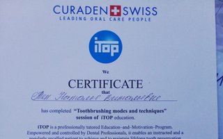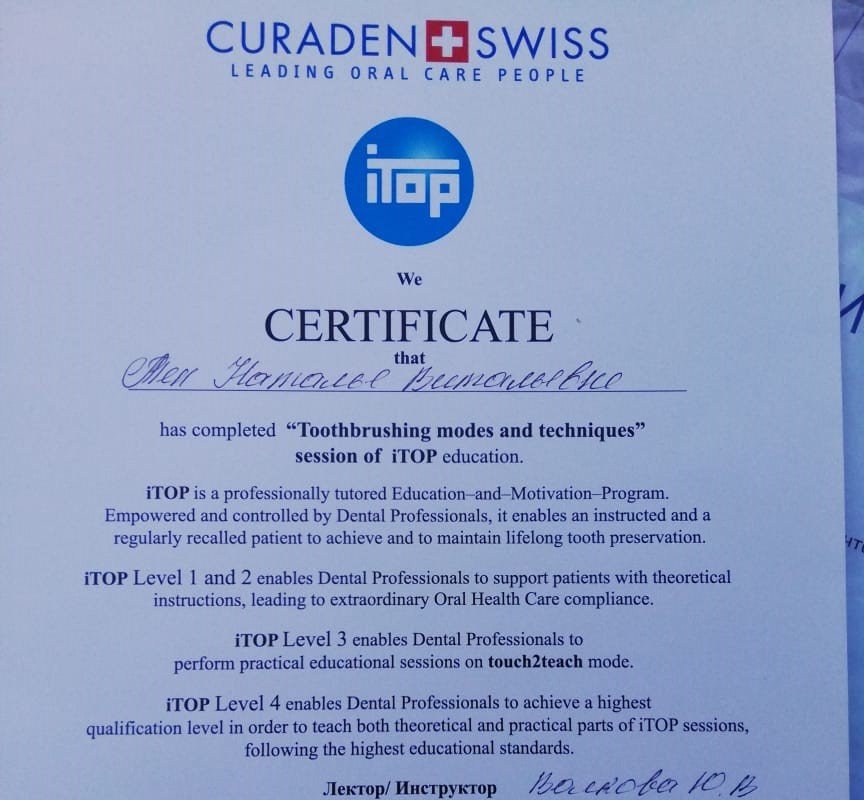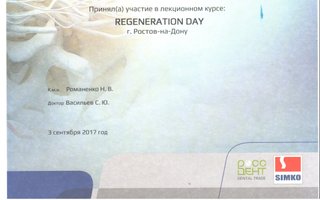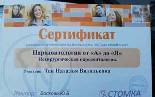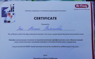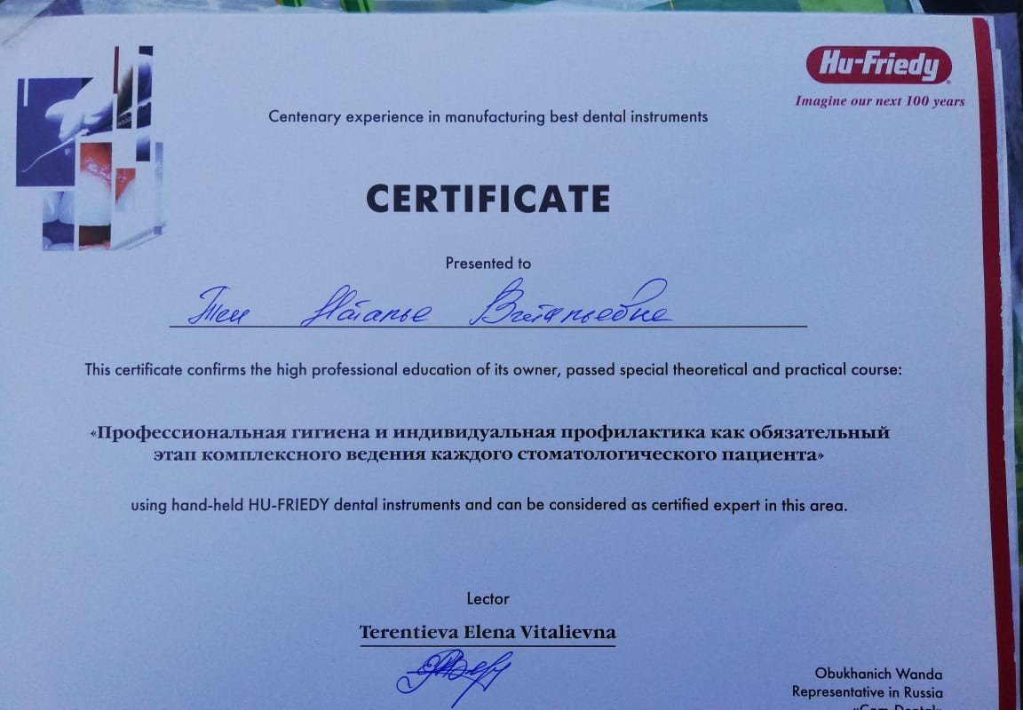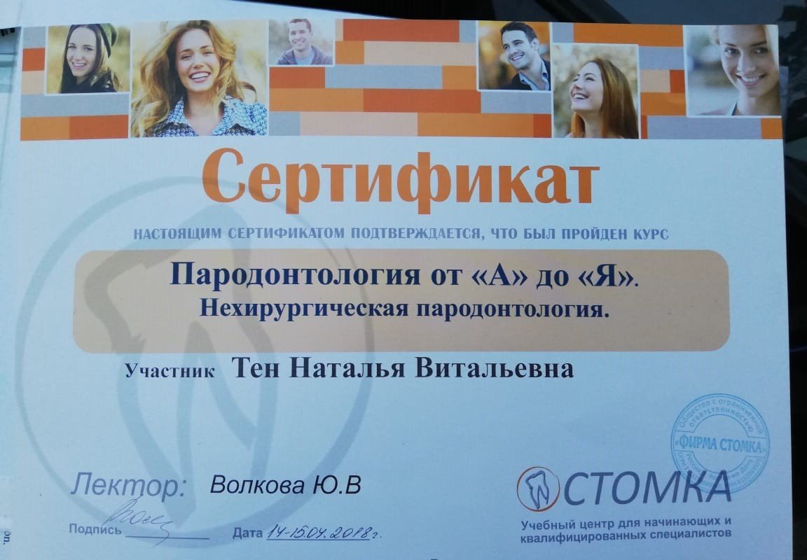 2018 г. - Сертификат «Пародонтология от А до Я. Нехирургическая пародонтология», Ростов-на-Дону; 2017 г. - Сертификат REGENERATION DAY, Ростов-на-Дону; Сертификат «Профессиональная гигиена и индивидуальная профилактика как обязательный этап комплексного введения каждого стоматологического пациента»; Сертификат «ITOP, CURAPROX»; Сертификат «Tooth brushing modes and techniques session of ITOP»