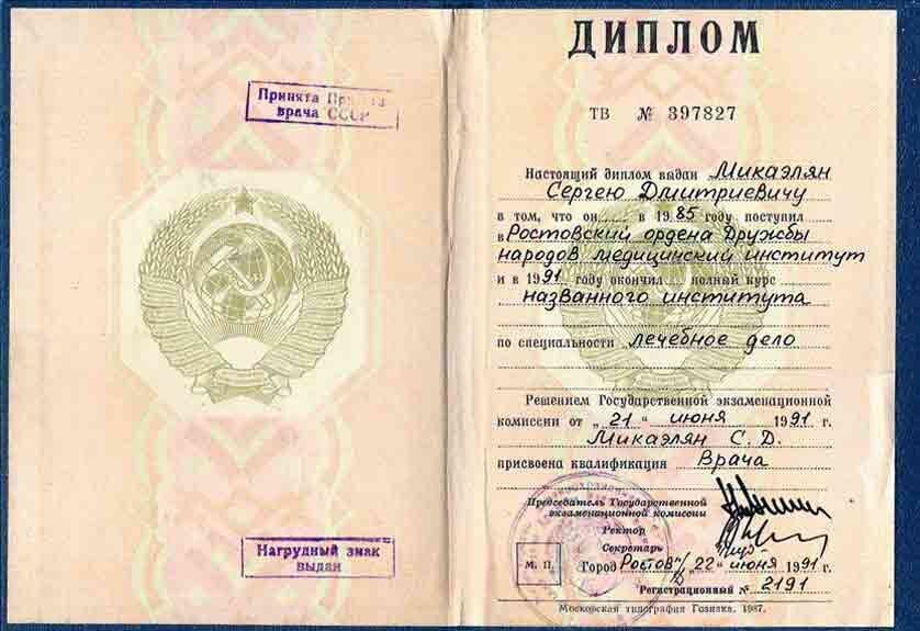 Места работы врача Сергея Дмитриевича Микаеляна