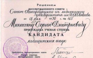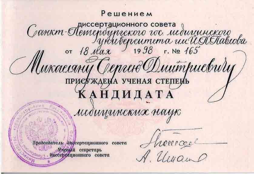 1998 — Защита диссертации на тему-» Новая методика чреспузырной аденомэктомии с лазерным гемостазом»в диссертационном совете Санкт- Петербурского государственного университета им.И.П.Павлова. Присуждена ученая степень-Кандидат медицинских наук