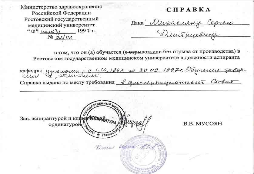 1993–1997 — Аспирантура при кафедре урологии Ростовского Государственного медицинского Университета