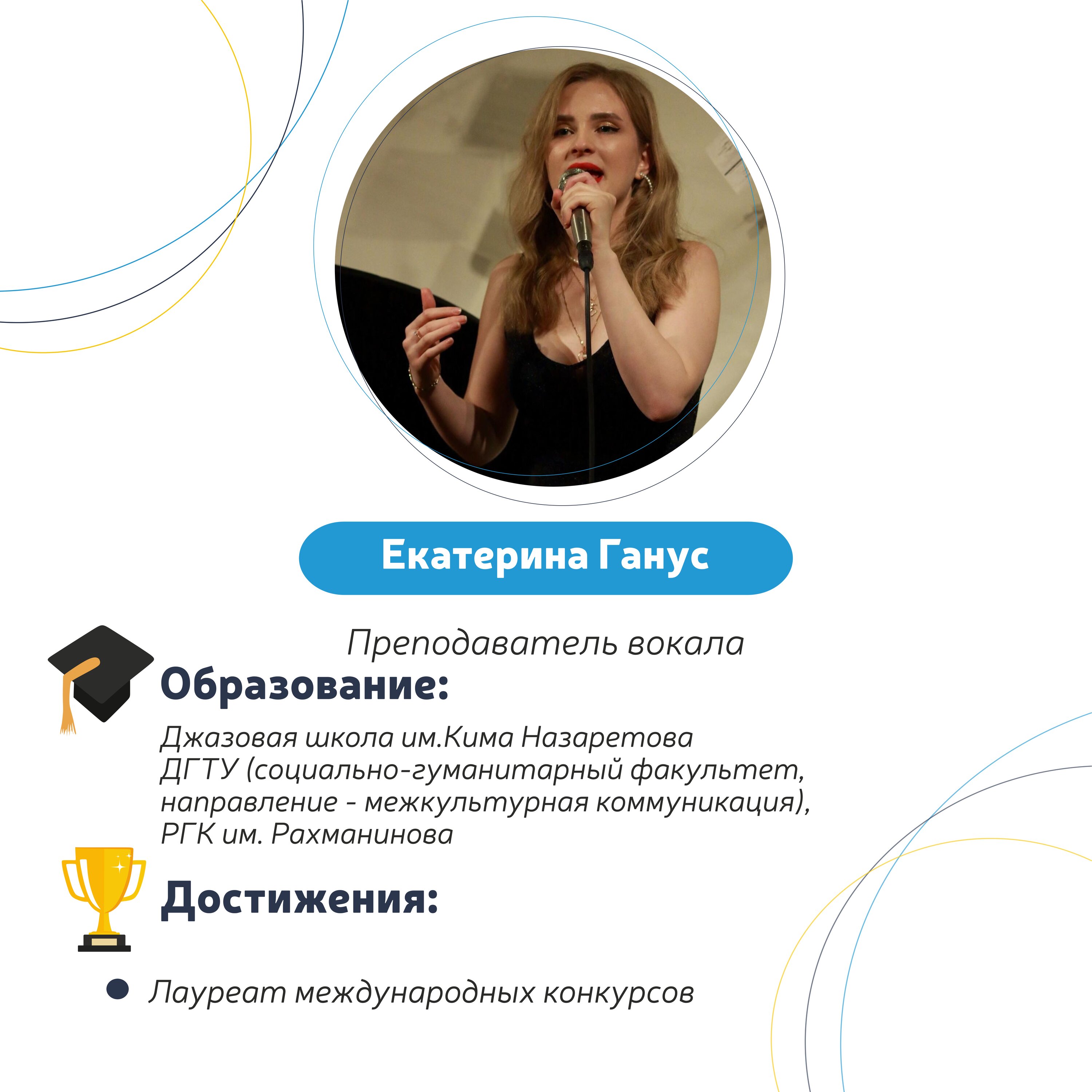 преподаватель эстрадно-джазового вокалаУчиться и развить какой-либо навык на должном уровне лучше всего у знающего по своему опыту специалиста. Перенимая не только знания, но и опыт, вы научитесь быстрее, но, что самое важное, овладеете тем, что реально пригодится - ведь он будет ориентироваться на ваш уровень. Свяжитесь с Ганус Екатериной, чтобы узнать о программе обучения.
